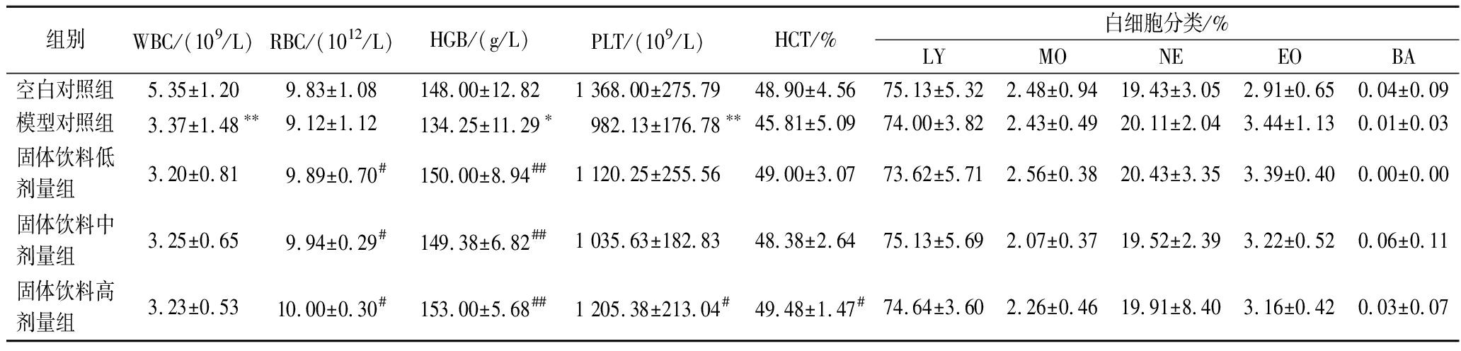 组别WBC/(109/L)RBC/(1012/L)HGB/(g/L)PLT/(109/L)HCT/%白细胞分类/%LYMONEEOBA空白对照组5.35±1.209.83±1.08148.00±12.821 368.00±275.7948.90±4.5675.13±5.322.48±0.9419.43±3.052.91±0.650.04±0.09模型对照组3.37±1.48∗∗9.12±1.12134.25±11.29∗982.13±176.78∗∗45.81±5.0974.00±3.822.43±0.4920.11±2.043.44±1.130.01±0.03固体饮料低剂量组3.20±0.819.89±0.70#150.00±8.94##1 120.25±255.5649.00±3.0773.62±5.712.56±0.3820.43±3.353.39±0.400.00±0.00固体饮料中剂量组3.25±0.659.94±0.29#149.38±6.82##1 035.63±182.8348.38±2.6475.13±5.692.07±0.3719.52±2.393.22±0.520.06±0.11固体饮料高剂量组3.23±0.5310.00±0.30#153.00±5.68##1 205.38±213.04#49.48±1.47#74.64±3.602.26±0.4619.91±8.403.16±0.420.03±0.07