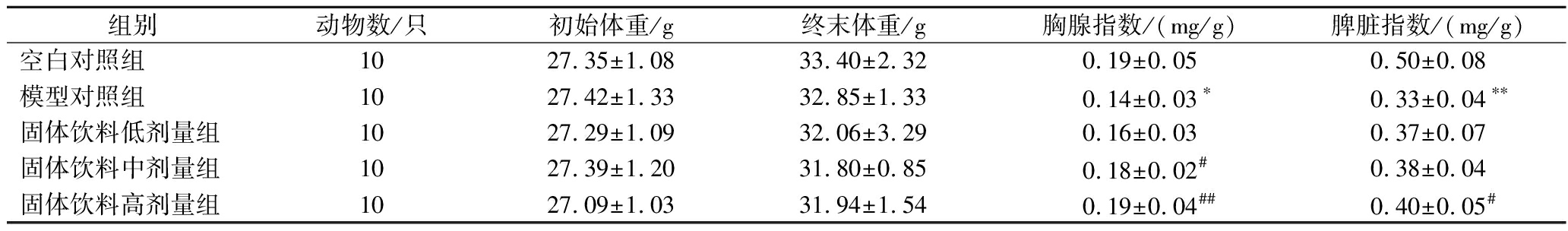 组别动物数/只初始体重/g终末体重/g胸腺指数/(mg/g)脾脏指数/(mg/g)空白对照组1027.35±1.0833.40±2.320.19±0.050.50±0.08模型对照组1027.42±1.3332.85±1.330.14±0.03∗0.33±0.04∗∗固体饮料低剂量组1027.29±1.0932.06±3.290.16±0.030.37±0.07固体饮料中剂量组1027.39±1.2031.80±0.850.18±0.02#0.38±0.04固体饮料高剂量组1027.09±1.0331.94±1.540.19±0.04##0.40±0.05#