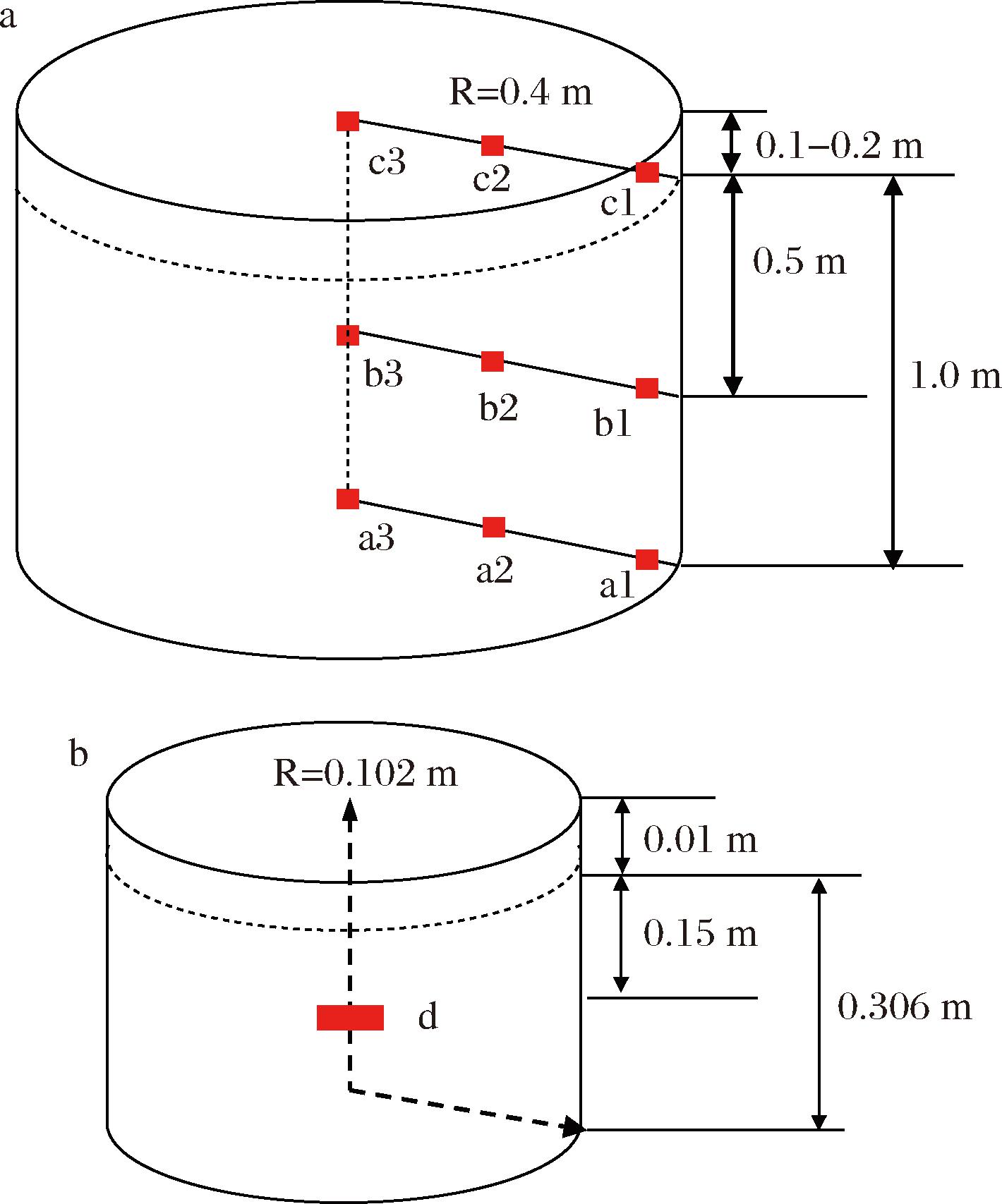 高粱和稻壳拌匀后上甑蒸粮,蒸粮2~3 h。蒸好后摊晾至30 ℃以下,拌曲发酵,发酵罐置于恒温恒湿培养箱(25 ℃,相对湿度70%)中发酵28 d。从发酵第0天开始,分别采集发酵0、3、7、10、15、21、23、28 d的酒醅,取样点如图1所示。a1、a2、a3点指示地缸发酵底部取样点,深度为1.0 m;b1、b2、b3点指示地缸发酵内部取样点,深度为0.6~0.7 m;c1、c2、c3点指示地缸发酵上层取样点,深度为0.1~0.2 m;d点指示实验室规模发酵中层取样点,深度为0.16 m。