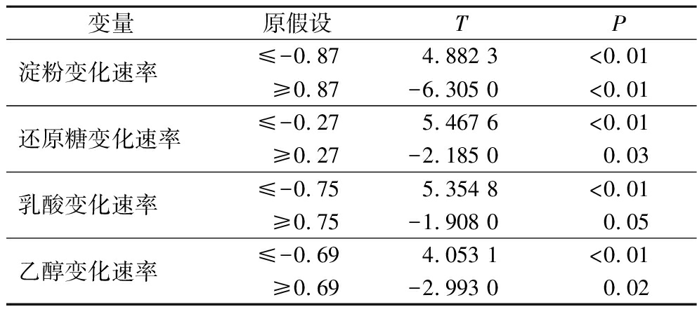 变量原假设TP淀粉变化速率≤-0.874.882 3<0.01≥0.87-6.305 0<0.01还原糖变化速率≤-0.275.467 6<0.01≥0.27-2.185 00.03乳酸变化速率≤-0.755.354 8<0.01≥0.75-1.908 00.05乙醇变化速率≤-0.694.053 1<0.01≥0.69-2.993 00.02