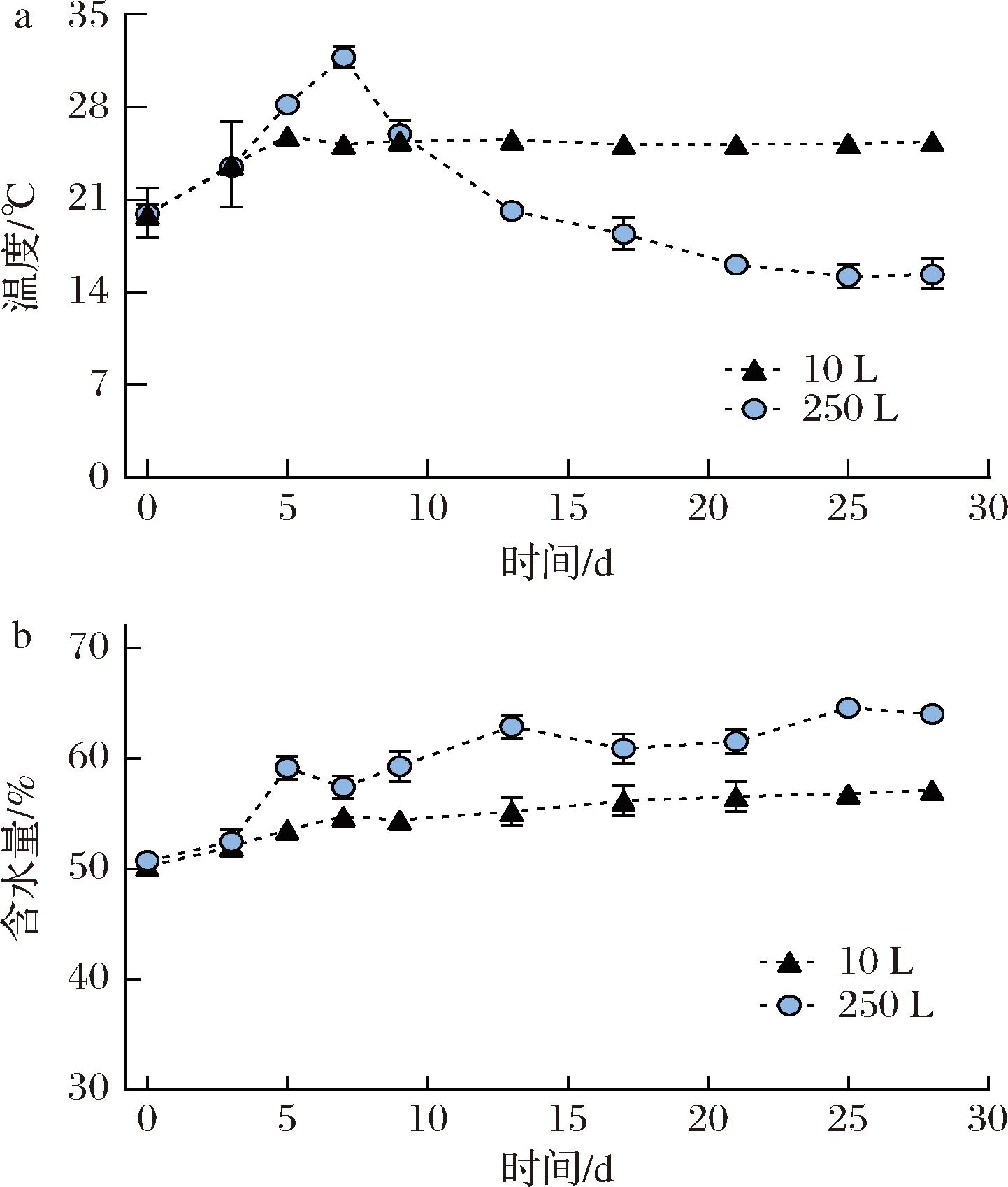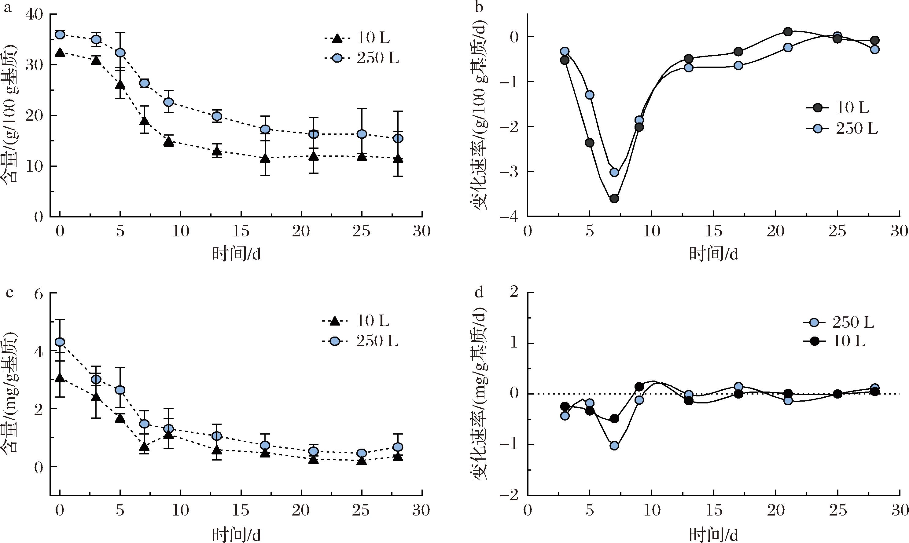 在10 L体系,温度曲线在初始阶段从较低温度[(19.87±0.81) ℃]逐渐上升到峰值[(25.36±0.06) ℃],之后在一个小范围内波动。相较于250 L体系,峰值更低且出现时间较早。这可能是由于大规模发酵体系体积较大,拥有更复杂的微生物群落结构,发酵过程中产生的热量较多,导致体系内部温度更高[24]。而小规模体系(10 L)的热交换面积与体积比更高,热量更容易散失到环境中,因此温度变化幅度不大。此外,生物代谢网络的多样性使得微生物能够适应不同的环境条件[25]。在较大的体系中,微生物可能需要更多的时间来适应环境变化,从而延后了峰值出现的时间。