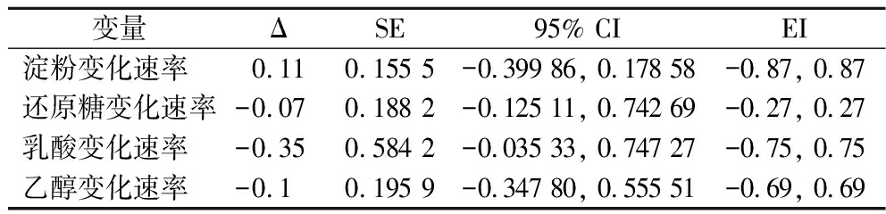 变量ΔSE95% CIEI淀粉变化速率0.110.155 5-0.399 86, 0.178 58-0.87, 0.87还原糖变化速率-0.070.188 2-0.125 11, 0.742 69-0.27, 0.27乳酸变化速率-0.350.584 2-0.035 33, 0.747 27-0.75, 0.75乙醇变化速率-0.10.195 9-0.347 80, 0.555 51-0.69, 0.69