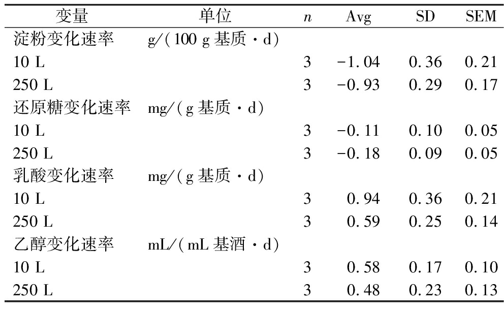 变量单位nAvgSDSEM淀粉变化速率g/(100 g基质·d)10 L3-1.040.360.21250 L3-0.930.290.17还原糖变化速率mg/(g基质·d)10 L3-0.110.100.05250 L3-0.180.090.05乳酸变化速率mg/(g基质·d)10 L30.940.360.21250 L30.590.250.14乙醇变化速率mL/(mL基酒·d)10 L30.580.170.10250 L30.480.230.13
