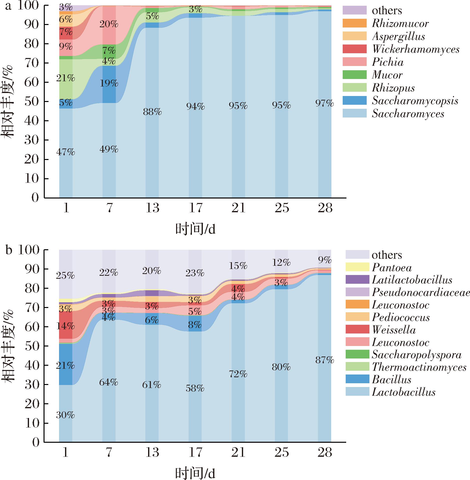 图5展示了基于扩增子测序的细菌和真菌在属水平上的相对丰度时序变化。由图5-a可知,发酵酒醅中优势真菌属(平均相对丰度>5%)为5个,包括酵母属(Saccharomyces)、复膜酵母属(Saccharomycopsis)、根霉属(Rhizopus)、毕赤酵母属(Pichia)和维克汉姆酵母属(Wickerhamomyces)。发酵15 d后,Saccharomyces成为优势菌,占绝对主导地位(相对丰度>94%)。先前的研究已证实,在清香型白酒的发酵过程中,Pichia是主要的优势菌群,被认为是具有乙醇和酯类物质生产能力的主要酵母属[30-31]。Pichia在4~8 d含量迅速上升,与图4-c乙醇含量的增长相呼应。随着发酵的进行,酒醅中高酸度和高乙醇浓度使酒醅中Aspergillus及Saccharomycopsis相对丰度降低。发酵终点(28 d)时,Aspergillus相对丰度降低至0.20%左右,Saccharomycopsis相对丰度降低至0.82%。这些结果与王雪山等[32]对大曲清香型白酒生产过程发酵酒醅的研究结果一致。因此,即使在不同的发酵规模下,清香型白酒的发酵过程中仍然由相同的优势微生物群落所主导,表现出微生物群落的稳定性。
