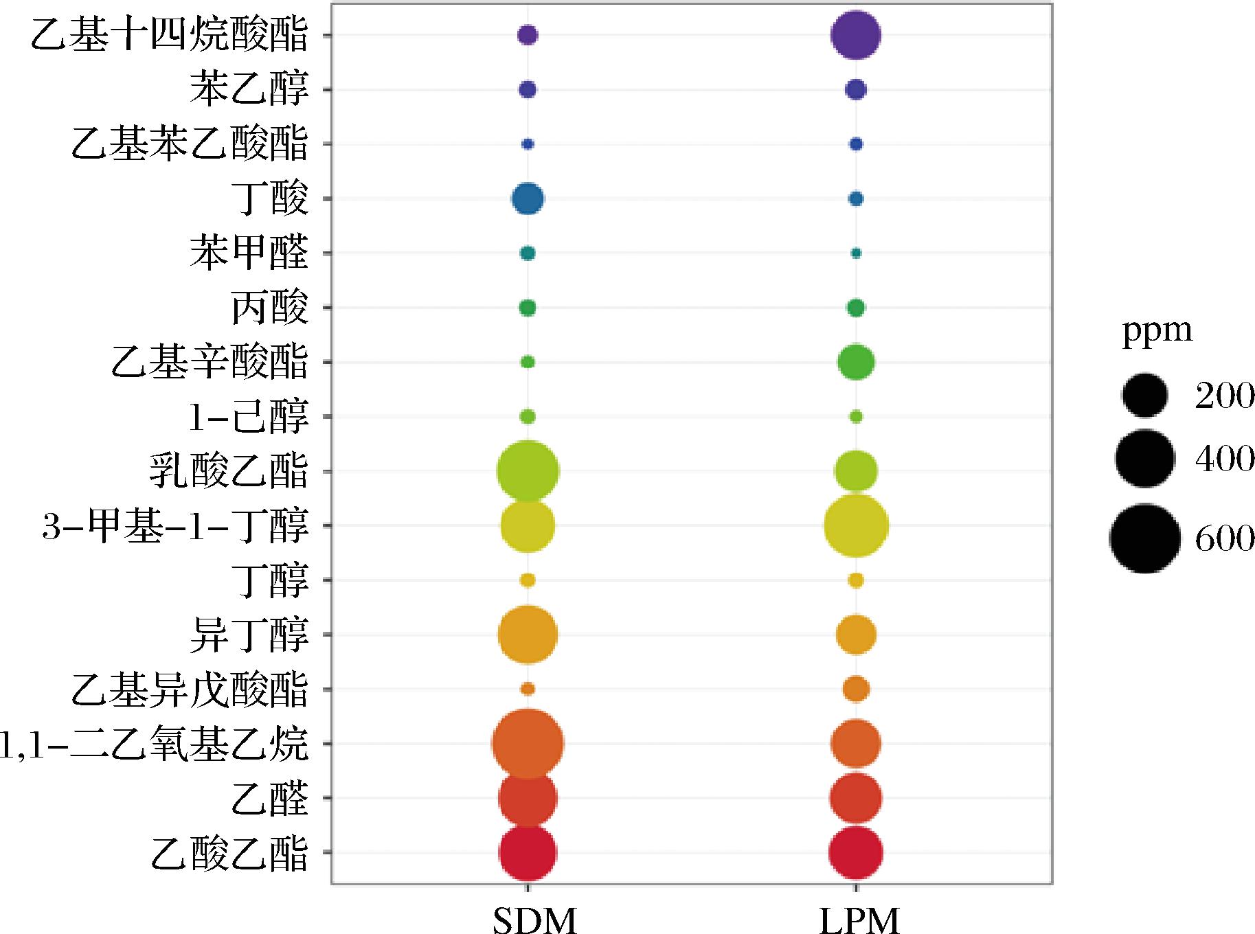 风味物质含量和比例关系是影响白酒品质的关键因素,而发酵容器、操作条件和发酵环境的变化会导致风味组分浓度的不同[37]。尽管2种体系中化合物的浓度存在差异,但它们均在各自体系中显示出较高的丰度,凸显了其在白酒风味形成中的关键作用。这一结果验证了缩小规模研究的可行性,表明在不同的发酵条件下也能够保持主体风味物质的一致性。