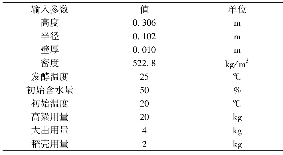 输入参数值单位高度0.306m半径0.102m壁厚0.010m密度522.8kg/m3发酵温度25℃初始含水量50%初始温度20℃高粱用量20kg大曲用量4kg稻壳用量2kg