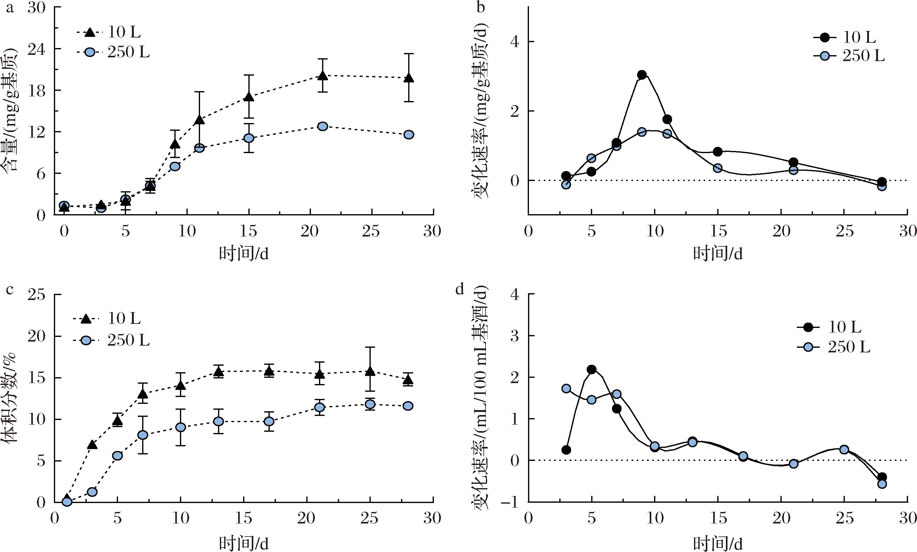 图4-c显示了10 L和250 L体系内乙醇含量随时间变化的曲线。在发酵初期(0~7 d),乙醇含量持续上升;在发酵中后期(8~28 d),2个体系内乙醇含量的变化曲线较为平稳。由图4-d可知,发酵第7天直至发酵终点期间,2个体系内乙醇变化速率保持一致,说明2个体系内微生物群落结构在此期间基本相同。