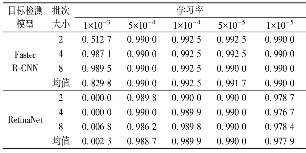 本研究讨论了目标检测中常用的Faster R-CNN模型[12]与RetinaNet模型[13]在包包曲截面检测中的效果,探讨了批次大小分别为2、4、8,学习率分别为1×10-3、5×10-4、1×10-4、5×10-5、1×10-5的工况,各工况下验证集AP75指标如表1所示。