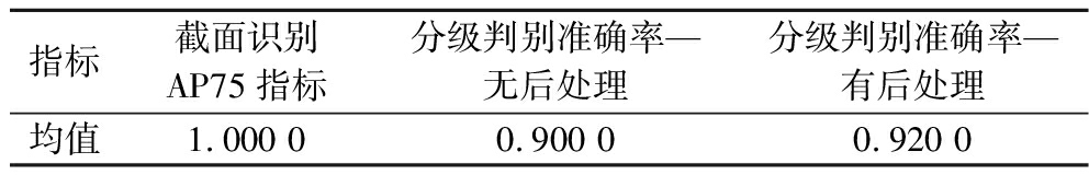 指标截面识别AP75指标分级判别准确率—无后处理分级判别准确率—有后处理均值1.000 00.900 00.920 0