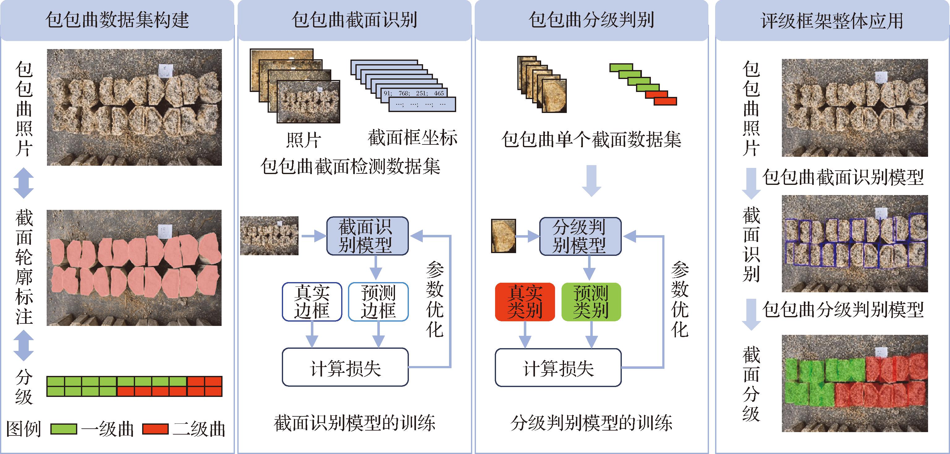 本研究提出了一种基于深度学习的五粮液包包曲分级框架,旨在实现包包曲的智能化识别和标准化分级。如图1所示,该框架主要由包包曲数据集构建、包包曲截面识别、包包曲分级判别、分级框架的整体应用4个关键部分组成。通过这一框架,可以有效提升包包曲分级的准确性和一致性,减少人工判断的主观性,提高酿酒工业的自动化和智能化水平。本节对整个分级框架的流程进行介绍,具体的实验分析和模型性能讨论将在第2节展开。