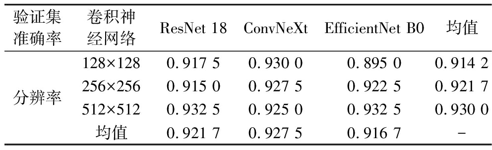 本研究所讨论的3种不同模型和3种不同分辨率对应的验证集准确率结果如表2所示。总体而言,各模型以及分辨率对应的验证集准确率相差较小,最大值和最小值相差0.037 5。其中,分辨率512×512对应的ResNet 18网络和EfficientNet B0网络的验证集准确率最高,为0.932 5。
