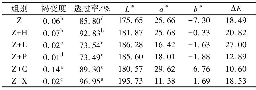 组别褐变度透过率/%L∗a∗b∗ΔEZ0.06b85.80d175.6525.66-7.3018.49Z+H0.07b92.83b181.8725.68-0.3320.82Z+L0.02c73.54e186.2816.42-1.6327.00Z+P0.01d73.49e185.6018.01-1.8812.89Z+C0.14a89.30c180.5729.62-6.7610.60Z+X0.02c96.95a195.7311.38-1.6918.53