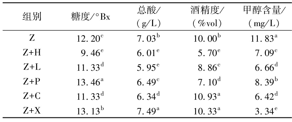 组别糖度/°Bx总酸/(g/L)酒精度/(%vol)甲醇含量/(mg/L)Z12.20c7.03b10.00b11.83aZ+H9.46e6.01e5.70e7.09cZ+L11.33d5.95e8.86c6.66dZ+P13.46a6.49c7.10d8.39bZ+C11.33d6.34d10.93a6.42dZ+X13.13b7.49a10.33a3.34e