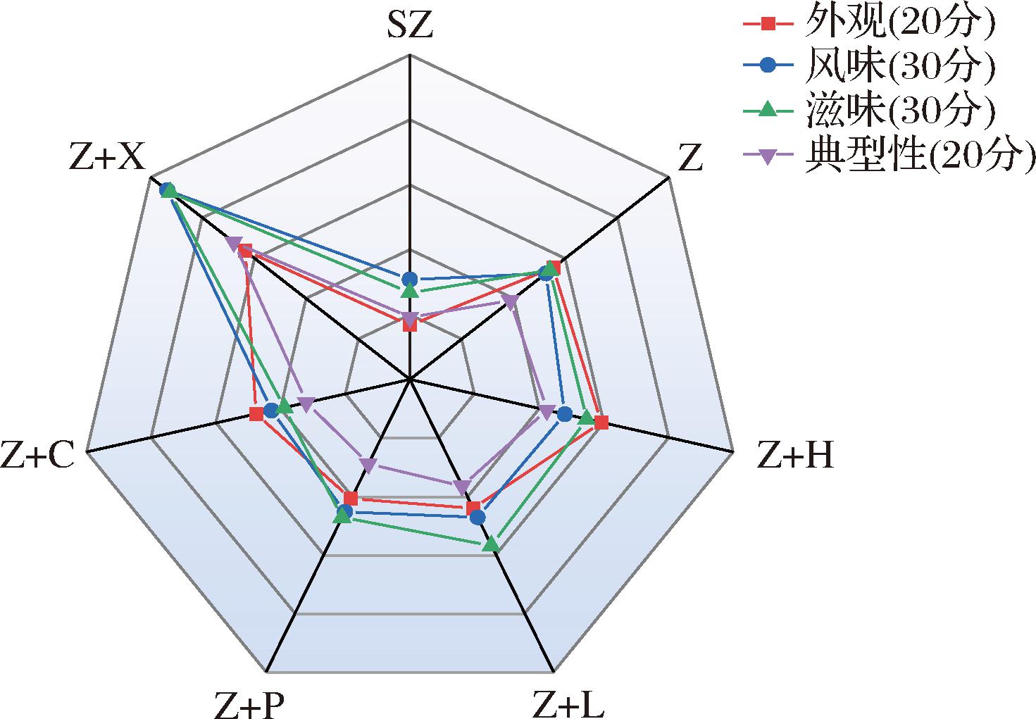 为了更全面地揭示不同紫薯酒感官差异,选取了一款市售紫薯酒作为对照进行感官评价。分别从发酵酒外观、风味、滋味、典型性4个部分对不同组别的发酵酒进行感官评价,评分结果如图2所示。Z+X酒:79.4分,Z酒:50.1分,Z+H酒:51.1分,Z+L酒:46.1分,Z+P酒:40.5分,Z+C酒;40.3分,SZ酒:23.4分。添加水果混合发酵,对紫薯酒的感官评价有不同程度的改善。其中市售紫薯酒的感官评价总分最低,Z+X酒感官评价总分最高为79.4分。在风味评价中,Z+X酒具有更浓郁的果酒甜香味和果香味,可能与其丰富的酯类化合物有关。此外,Z+X酒的典型性风味突出,可能与其较多的挥发性物质有关(见风味分析部分)。综上,Z+X酒整体感官评价较高。