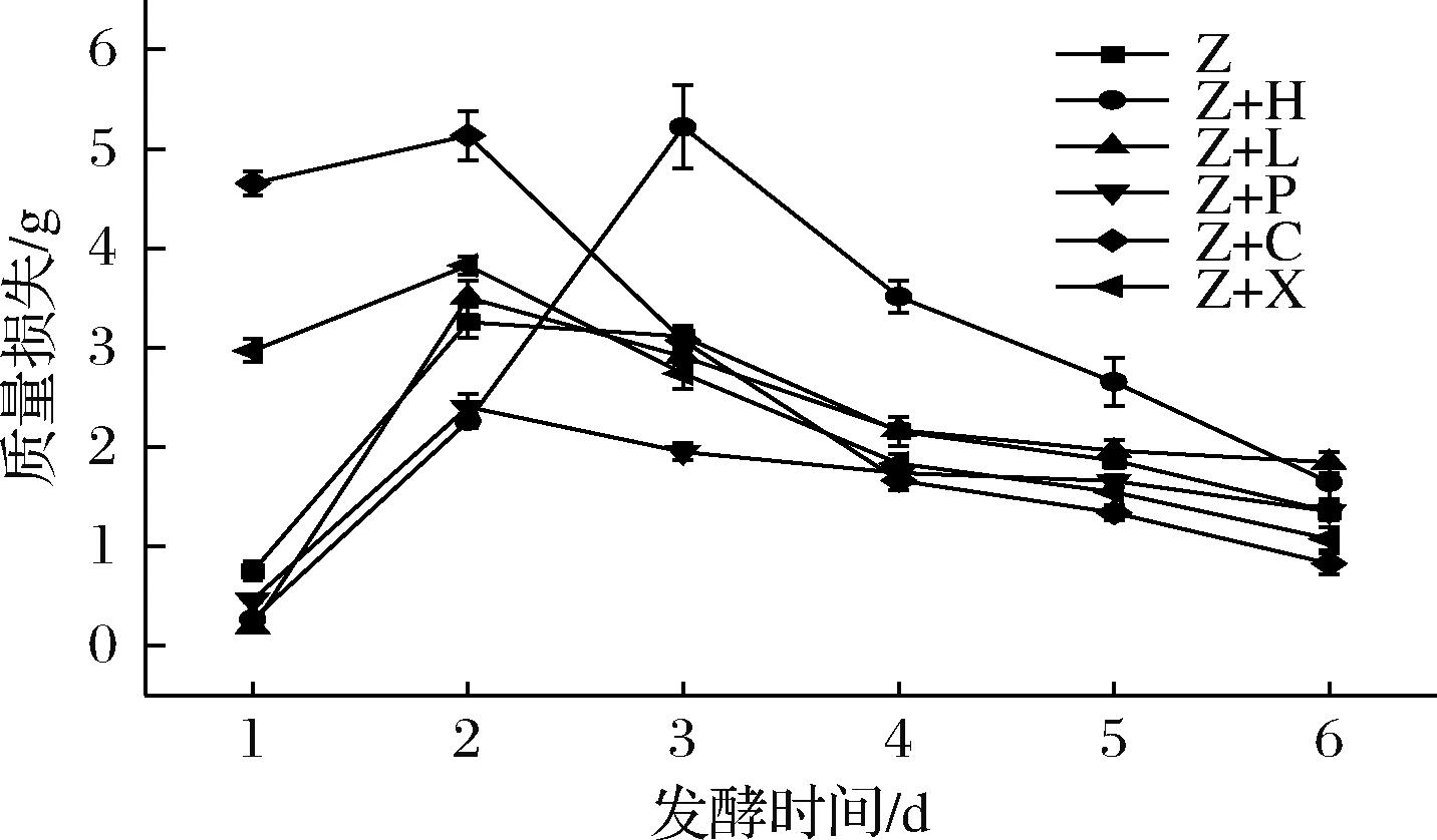 监测各发酵组1~6 d的质量损失,以g为单位绘制发酵曲线。
