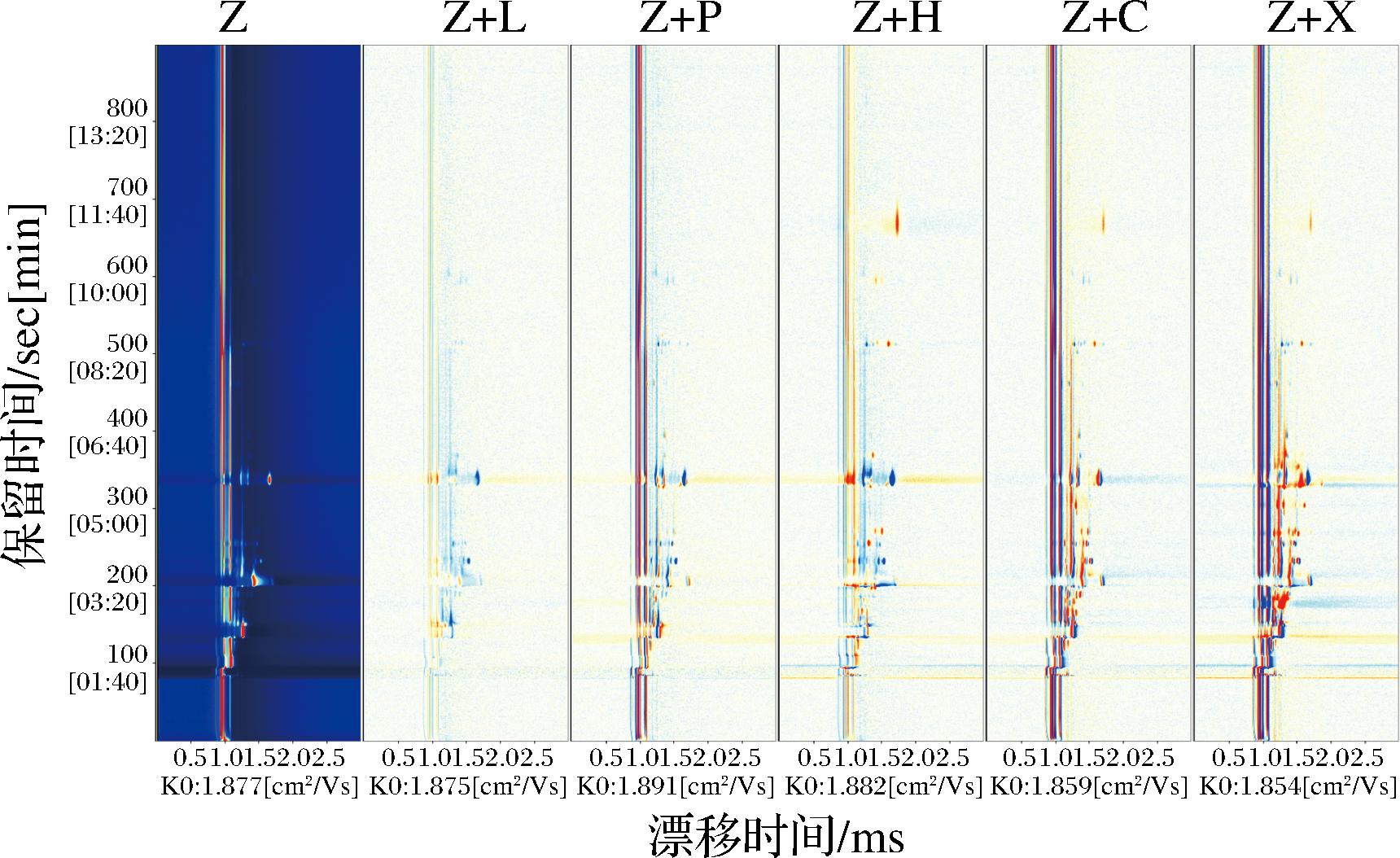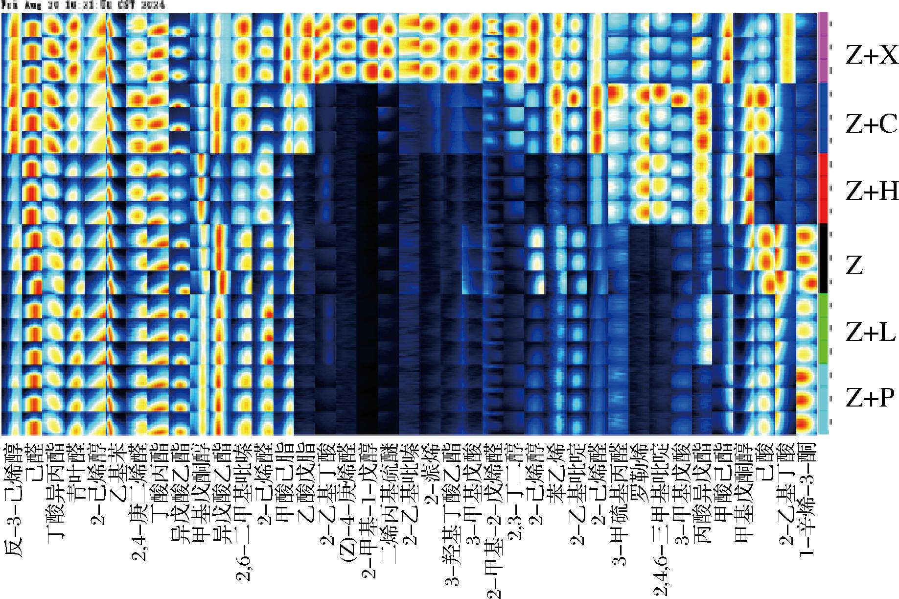 为了比较单一紫薯发酵酒与水果加紫薯混合发酵酒的挥发性化合物,采用GC-IMS分析,以单一紫薯酒发酵的迁移谱图为对照,生成差异对比图,扣除背景对比显示得到差异谱图。蓝色区域说明该物质浓度在此样品中较Z发酵酒样低,红色区域说明该物质浓度在此样品中较Z酒发酵酒样高。由图4可知,添加不同水果与紫薯发酵,挥发性化合物浓度呈不同程度增加,说明添加水果与紫薯混合发酵可以促进紫薯发酒酵过程中的挥发性有机化合物质生成,其中Z+P、Z+C、Z+X酒的挥发性化合物浓度较高。