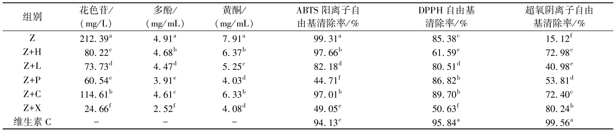 组别花色苷/(mg/L)多酚/(mg/mL)黄酮/(mg/mL)ABTS阳离子自由基清除率/%DPPH自由基清除率/%超氧阴离子自由基清除率/%Z212.39a4.91a7.91a99.31a85.38c15.12fZ+H80.22c4.68b6.37b97.66b61.59e72.98cZ+L73.73d4.47d5.25c82.18d80.51d40.98eZ+P60.54e3.91e4.03d44.71f86.82b53.81dZ+C114.61b4.61c6.33b97.01b89.70b72.40cZ+X24.66f2.52f4.08d49.05e50.63f80.24b维生素C---94.13c95.84a99.56a