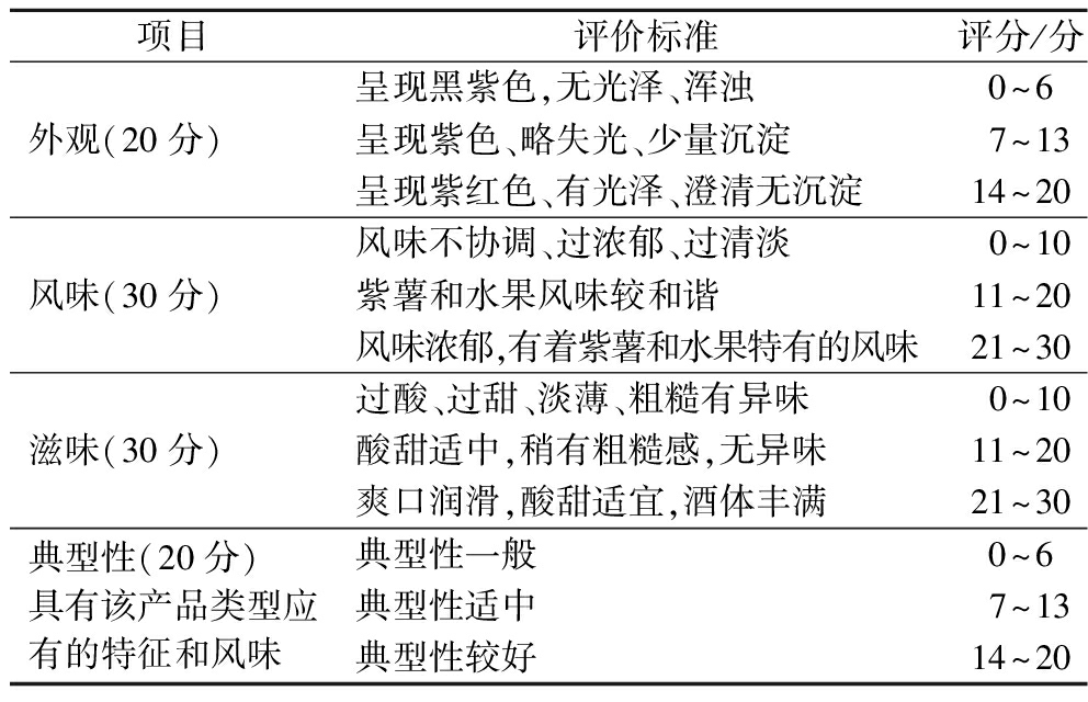 项目评价标准评分/分外观(20分)呈现黑紫色,无光泽、浑浊0^6呈现紫色、略失光、少量沉淀7^13呈现紫红色、有光泽、澄清无沉淀14^20风味(30分)风味不协调、过浓郁、过清淡0^10紫薯和水果风味较和谐11^20风味浓郁,有着紫薯和水果特有的风味21^30滋味(30分)过酸、过甜、淡薄、粗糙有异味0^10酸甜适中,稍有粗糙感,无异味11^20爽口润滑,酸甜适宜,酒体丰满21^30典型性(20分)具有该产品类型应有的特征和风味典型性一般0^6典型性适中7^13典型性较好14^20