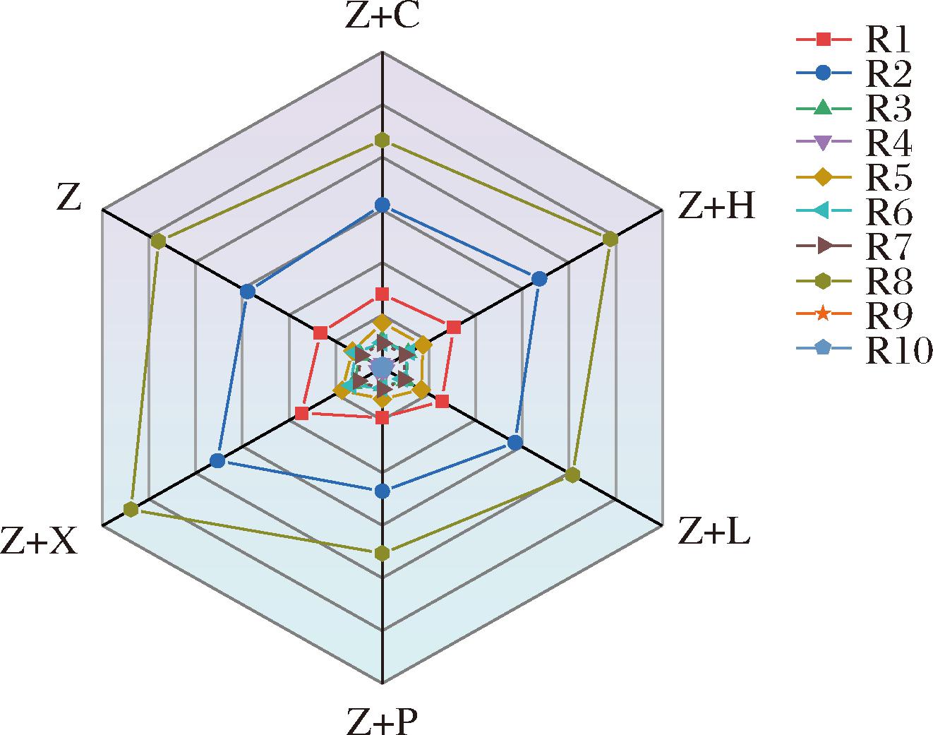 对各发酵组别进行电子鼻雷达图分析,传感器的响应强度与样品中相应化合物的含量密切相关[18]。结果如图3所示:R8、R2、R1这3个感应器对酒的响应值较高,说明各酒样中有较多的醇和醛酮类、氮氧化合物、芳香成分——苯类。与其他发酵组相比,Z+X酒的R8、R2、R1这3个感应器的响应值最强的。表明添加香蕉与紫薯混合发酵有利于芳香族等香气化合物的形成。