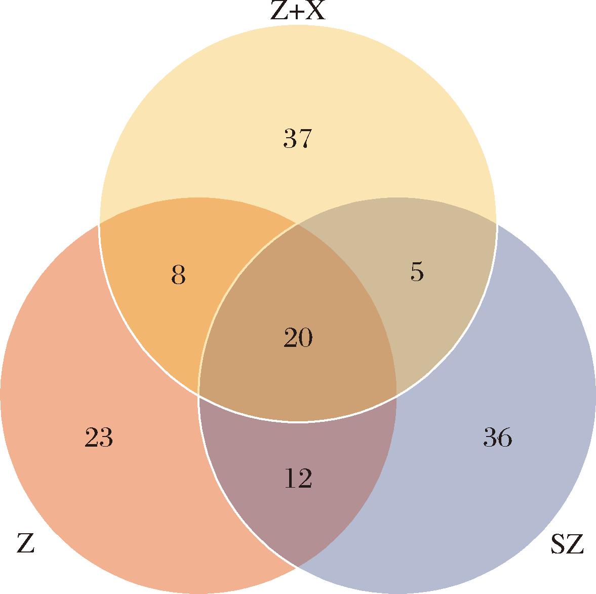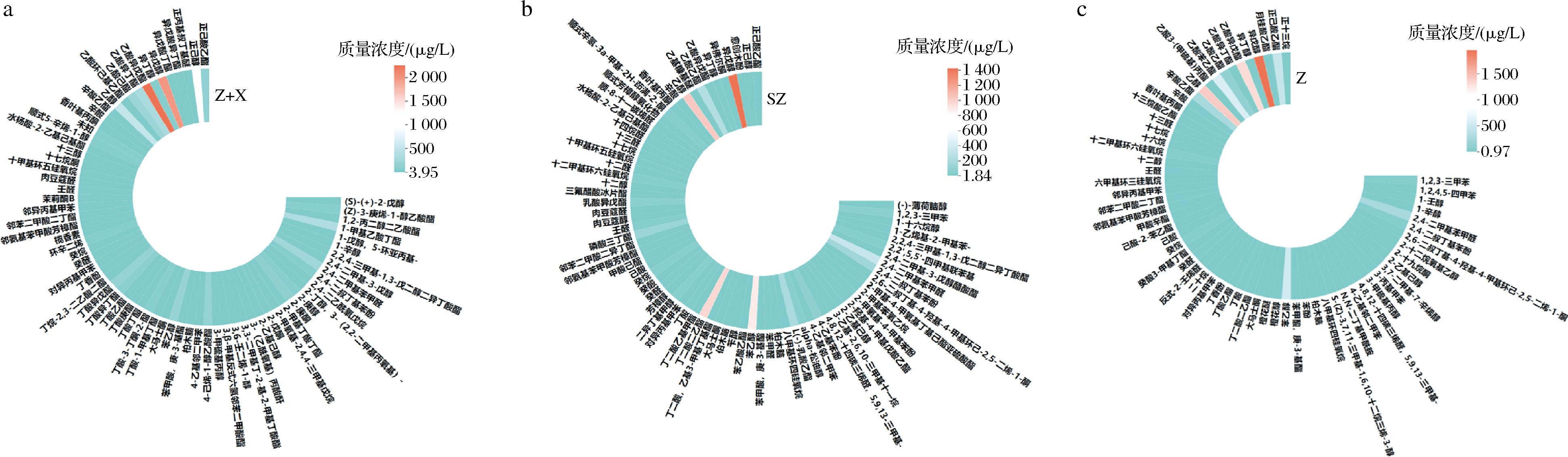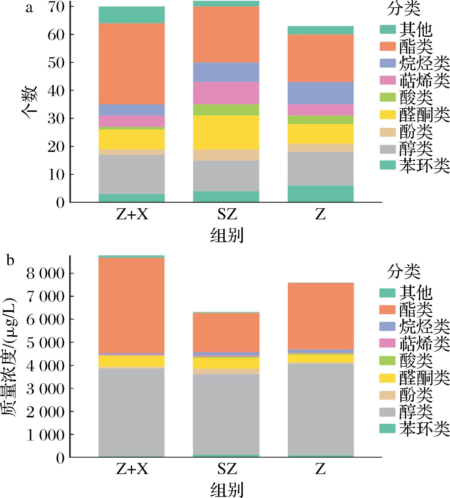 采用GC-MS技术对单一紫薯酒与紫薯与香蕉混合发酵酒挥发性有机化合物进行定量分析,并选择一款市售紫薯酒(SZ)作为对照。聚类热图将GC-MS分析得到的香气物质进行数据可视化,颜色的变化代表挥发性有机化合物浓度的大小[19]。由图6可知,Z、Z+X、SZ酒分别检测出63、70、73种化合物,从热图中来看,正己酸乙酯、异戊醇、乙酸异戊酯、乙酸苯乙酯、辛酸乙酯、苯乙醇等在样品间占主导地位。由图7可知,3种不同紫薯酒共同有20种香气成分,Z酒与Z+X酒共有的香气成分28种,Z酒与SZ酒共有的香气成分32种,Z+X酒与SZ酒共有香气成分25种,说明3种不同的紫薯酒的香气成分具有较大的差异。由图8可知,3种紫薯酒的挥发性香气物质的组成和含量存在差异。从分类上看,三者检测出最多的种类都是酯类,其中Z酒有17种、Z+X酒有29种、SZ酒有20种。与Z酒、SZ酒相比,Z+X酒的酯类增加了一半以上,其中增加的丁酸庚酯、丁酸-1-甲基丁酯、丁酸-3-丁酮-2-酯、异戊酸丁酯、异戊酸异丁酯、乙酸己酯、丁酸异丁酯、乙酸环己基乙酯赋予了紫薯酒更多的水果香味、花香味,为果酒增添复杂的风味和层次感[20]。