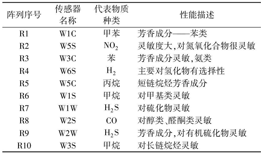 阵列序号传感器名称代表物质种类性能描述R1W1C甲苯芳香成分———苯类R2W5SNO2灵敏度大,对氮氧化合物很灵敏R3W3C苯芳香成分灵敏,氨类R4W6SH2主要对氢化物有选择性R5W5C丙烷短链烷烃芳香成分R6W1S甲烷对甲基类灵敏R7W1WH2S对硫化物灵敏R8W2SCO对醇类、醛酮类灵敏R9W2WH2S芳香成分,对有机硫化物灵敏R10W3S甲烷对长链烷烃灵敏