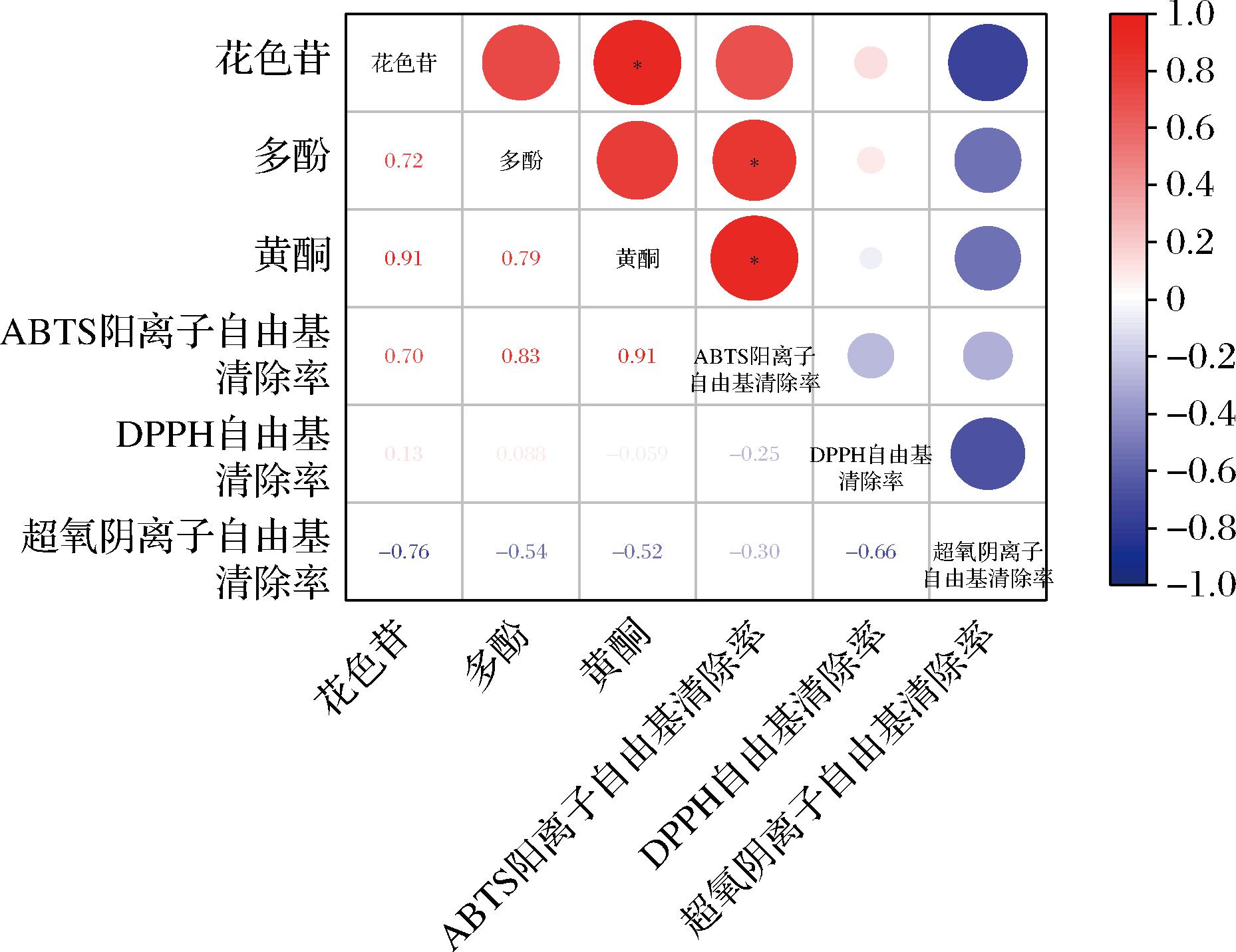 添加水果的发酵组别的超氧阴离子自由基的清除能力均高于单一紫薯发酵组,其原因是添加水果进行发酵增加了维生素C含量,有利于提高超氧阴离子自由基清除率。牛广财等[26]研究发现超氧阴离子自由基清除率与沙棘果酒中的维生素C含量之间呈正相关关系,而与总黄酮含量间的相关性不明显。并且发酵过程中,酵母利用果汁中的营养成分,如蛋白类,被利用水解,形成小肽类物质,具有抗氧化能力,协助抗氧化作用[27]。为进一步验证活性物质含量与体外抗氧化活性关联性,进行相关性分析,由图9可知,黄酮与花色苷含量存在显著性关系,多酚、黄酮含量与ABTS阳离子自由基清除率呈显著正相关,表明多酚和黄酮含量对紫薯酒的体外抗氧化活性具有显著影响,其中黄酮含量的影响力更高。
