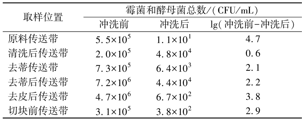 采用80 ℃热水对从原料传送到切丁装罐的所有传送带进行全面清洗。如表2所示,实验结果表明,清洗前原料传送带、清洗后传送带、去蒂传送带、去蒂后传送带、去皮后传送带和切块前传送带样品中的霉菌和酵母菌总数在2.0×105~7.2×106 CFU/mL,说明生产过程中存在着大量的真菌积累,冲洗后相应采样位置的霉菌和酵母菌总数均有下降,在4.8×104~1.1×105 CFU/mL,其中原料传送带冲洗前后霉菌和酵母菌总数下降最多,达到4.7 lg CFU/mL;冲洗后传送带洗前后霉菌和酵母菌总数下降最少,仅为0.6 lg CFU/mL。