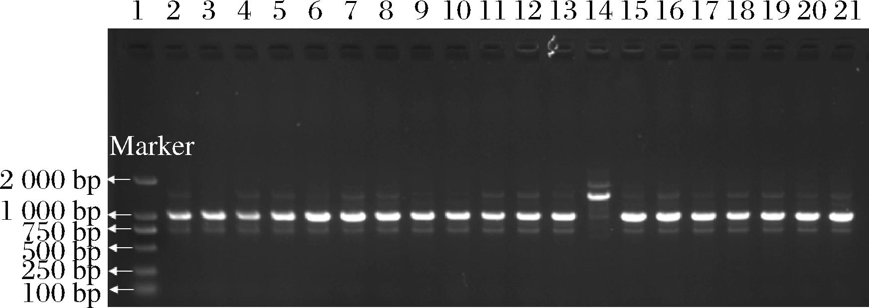 本研究以上述分离的20株热带假丝酵母为研究对象,利用S6作为随机引物进行RAPD扩增来进行热带假丝酵母的分型。琼脂糖凝胶电泳检测结果表明(图5),分离的20株热带假丝酵母可分为2种株型,分离于切块前传送带外侧样品的热带假丝酵母QKQW-2扩增的条带明显区别于其他菌株,单独为一种株型;其余19株热带假丝酵母扩增的条带一致,为同一株型,是引起番茄罐头腐败变质和胀罐的潜在腐败真菌。