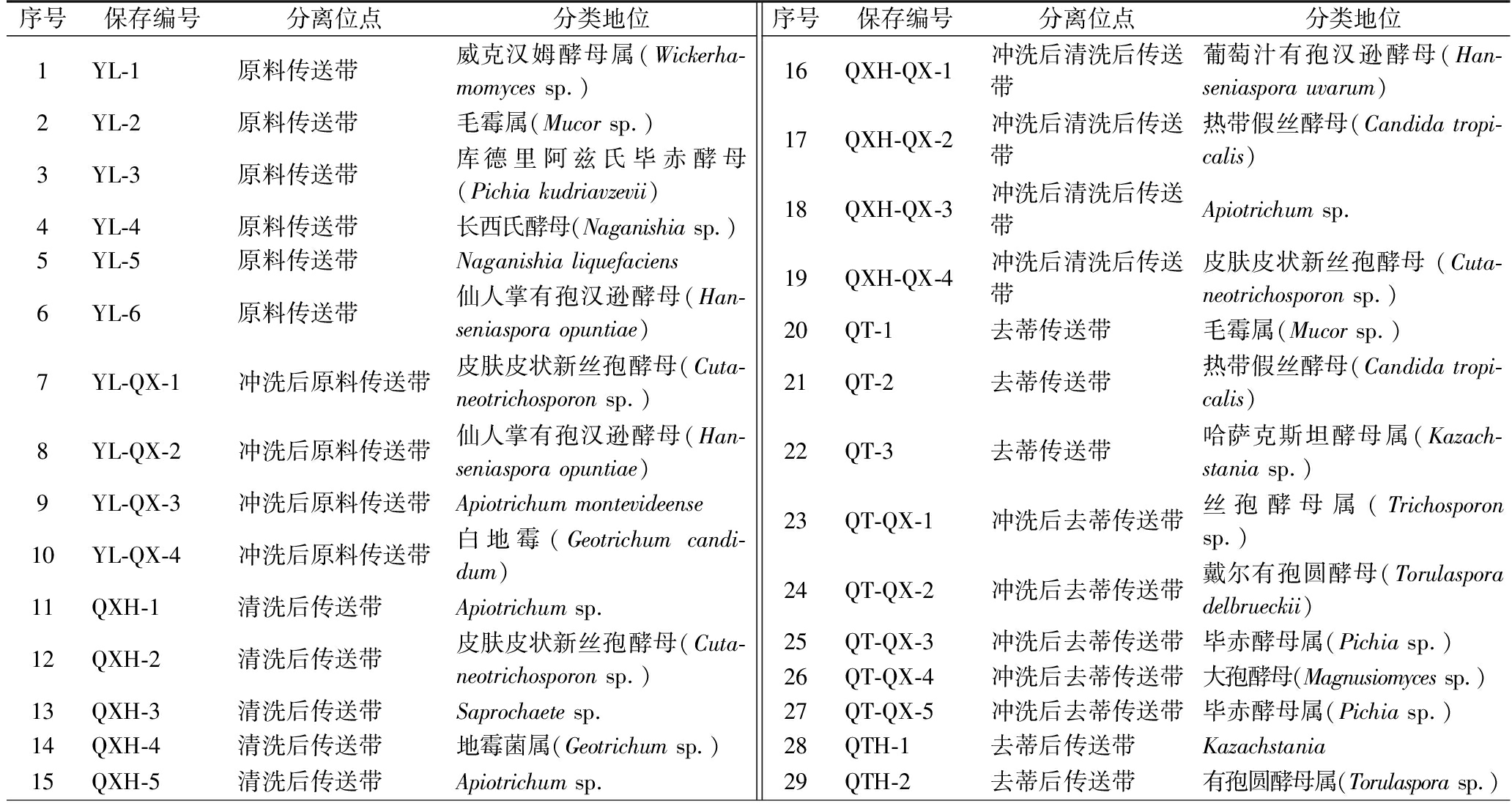 序号保存编号分离位点分类地位序号保存编号分离位点分类地位1YL-1原料传送带威克汉姆酵母属(Wickerha-momyces sp.)2YL-2原料传送带毛霉属(Mucor sp.)3YL-3原料传送带库德里阿兹氏毕赤酵母(Pichia kudriavzevii)4YL-4原料传送带长西氏酵母(Naganishia sp.)5YL-5原料传送带Naganishia liquefaciens6YL-6原料传送带仙人掌有孢汉逊酵母(Han-seniaspora opuntiae)7YL-QX-1冲洗后原料传送带皮肤皮状新丝孢酵母(Cuta-neotrichosporon sp.)8YL-QX-2冲洗后原料传送带仙人掌有孢汉逊酵母(Han-seniaspora opuntiae)9YL-QX-3冲洗后原料传送带Apiotrichum montevideense10YL-QX-4冲洗后原料传送带白地霉(Geotrichum candi-dum)11QXH-1清洗后传送带Apiotrichum sp.12QXH-2清洗后传送带皮肤皮状新丝孢酵母(Cuta-neotrichosporon sp.)13QXH-3清洗后传送带Saprochaete sp.14QXH-4清洗后传送带地霉菌属(Geotrichum sp.)15QXH-5清洗后传送带Apiotrichum sp.16QXH-QX-1冲洗后清洗后传送带葡萄汁有孢汉逊酵母(Han-seniaspora uvarum)17QXH-QX-2冲洗后清洗后传送带热带假丝酵母(Candida tropi-calis)18QXH-QX-3冲洗后清洗后传送带Apiotrichum sp.19QXH-QX-4冲洗后清洗后传送带皮肤皮状新丝孢酵母 (Cuta-neotrichosporon sp.)20QT-1去蒂传送带毛霉属(Mucor sp.)21QT-2去蒂传送带热带假丝酵母(Candida tropi-calis)22QT-3去蒂传送带哈萨克斯坦酵母属(Kazach-stania sp.)23QT-QX-1冲洗后去蒂传送带丝孢酵母属(Trichosporon sp.)24QT-QX-2冲洗后去蒂传送带戴尔有孢圆酵母(Torulaspora delbrueckii)25QT-QX-3冲洗后去蒂传送带毕赤酵母属(Pichia sp.)26QT-QX-4冲洗后去蒂传送带大孢酵母(Magnusiomyces sp.)27QT-QX-5冲洗后去蒂传送带毕赤酵母属(Pichia sp.)28QTH-1去蒂后传送带Kazachstania29QTH-2去蒂后传送带有孢圆酵母属(Torulaspora sp.)