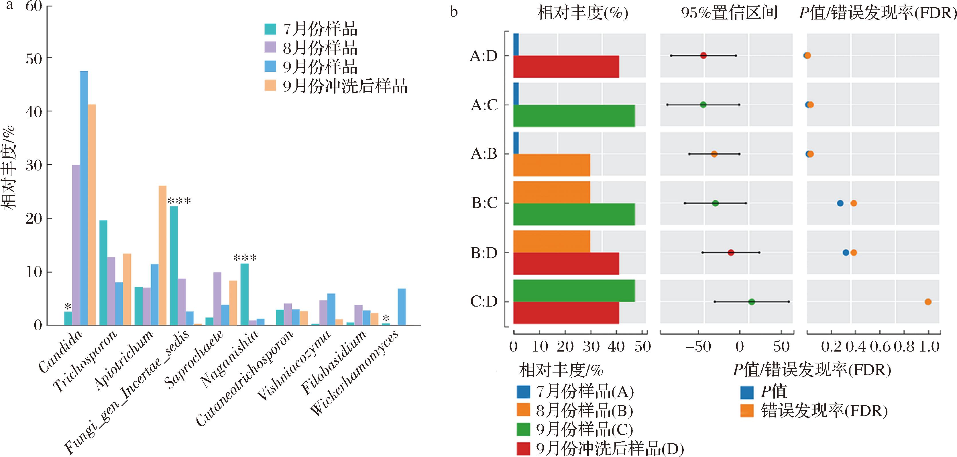 注:*表示即7月份样品与8月份样品、7月份样品与9月份样品、7月份样品与9月份清洗后样品两两相比的显著性差异;*代表P值<0.05,**代表P值<0.01,***代表P值<0.001。