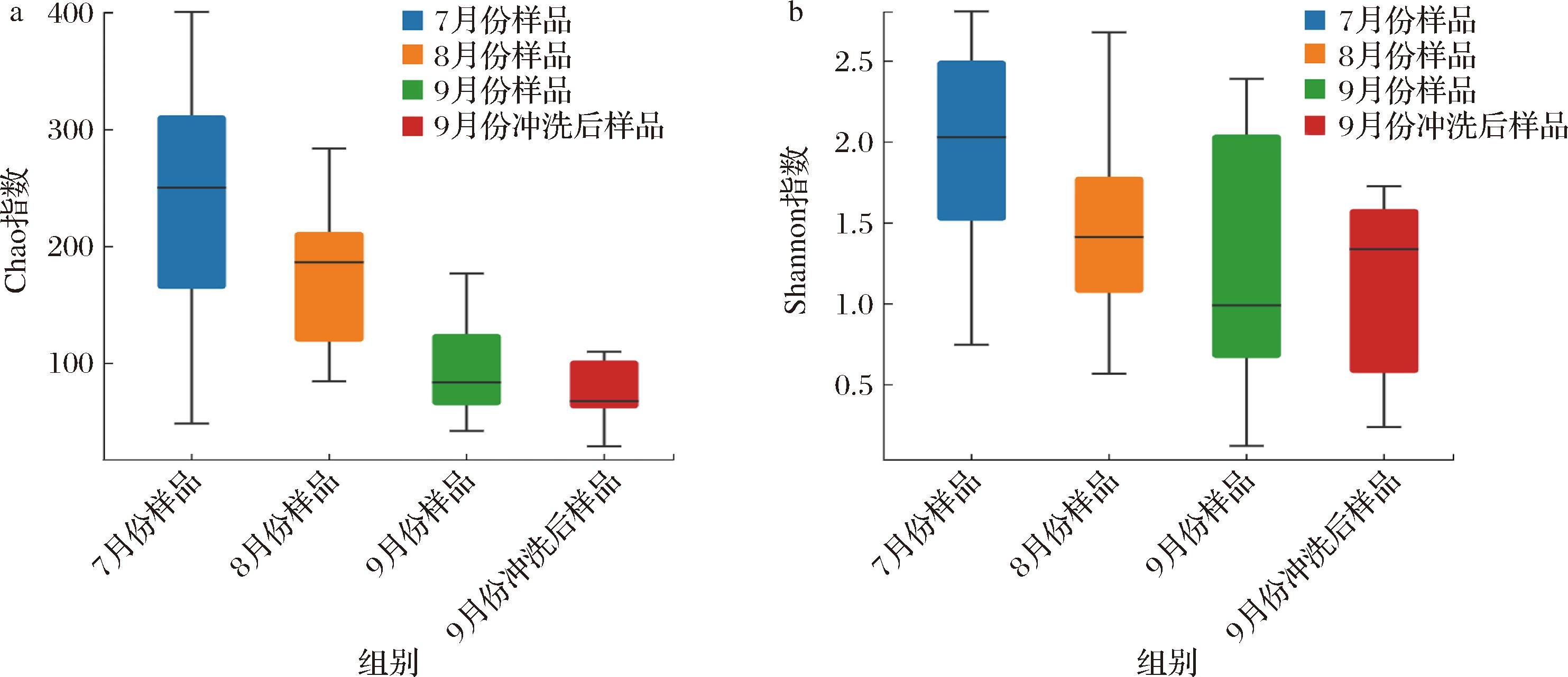 使用mothur软件对番茄生产过程中样品的真菌群落结构的Alpha多样性进行分析,来表征番茄生产过程各阶段的物种多样性。本研究主要比较不同季节以及冲洗前后样品的Chao指数和Shannon指数差异来探究生产时间和生产工艺优化对真菌群落结构多样性的影响。其中,Chao指数主要用于估计样品中的物种总数,该指数越大,表示样品中真菌群落的丰富度越高;Shannon指数主要用于反映真菌群落的多样性,该指数越大,表示样品中真菌物种多样性越高。多样性分析结果表明(图3-a),7月份样品、8月份样品、9月份样品和9月份冲洗后样品的Chao指数在28~401,物种总数的中位数随着生产的进行以及工艺的改变呈现下降的趋势,其中7月份样品Chao指数的波动最大,9月份清洗后样品的Chao指数的波动最小。4个样品的Shannon指数在0.11~2.81,其中9月份样品Shannon指数波动最大,9月份清洗后样品的Shannon指数的波动最小。随着生产的进行,Shannon指数整体上呈现下降趋势,表明随着生产的进行,腐败微生物逐渐集中在优势真菌上。此外,虽然9月份冲洗后样品的中位数高于9月份样品,但是整体波动小于9月份样品,推测冲洗后立即采样,样品中还存在着热水处理后的死亡的真菌,导致其多样性增加(图3-b)。