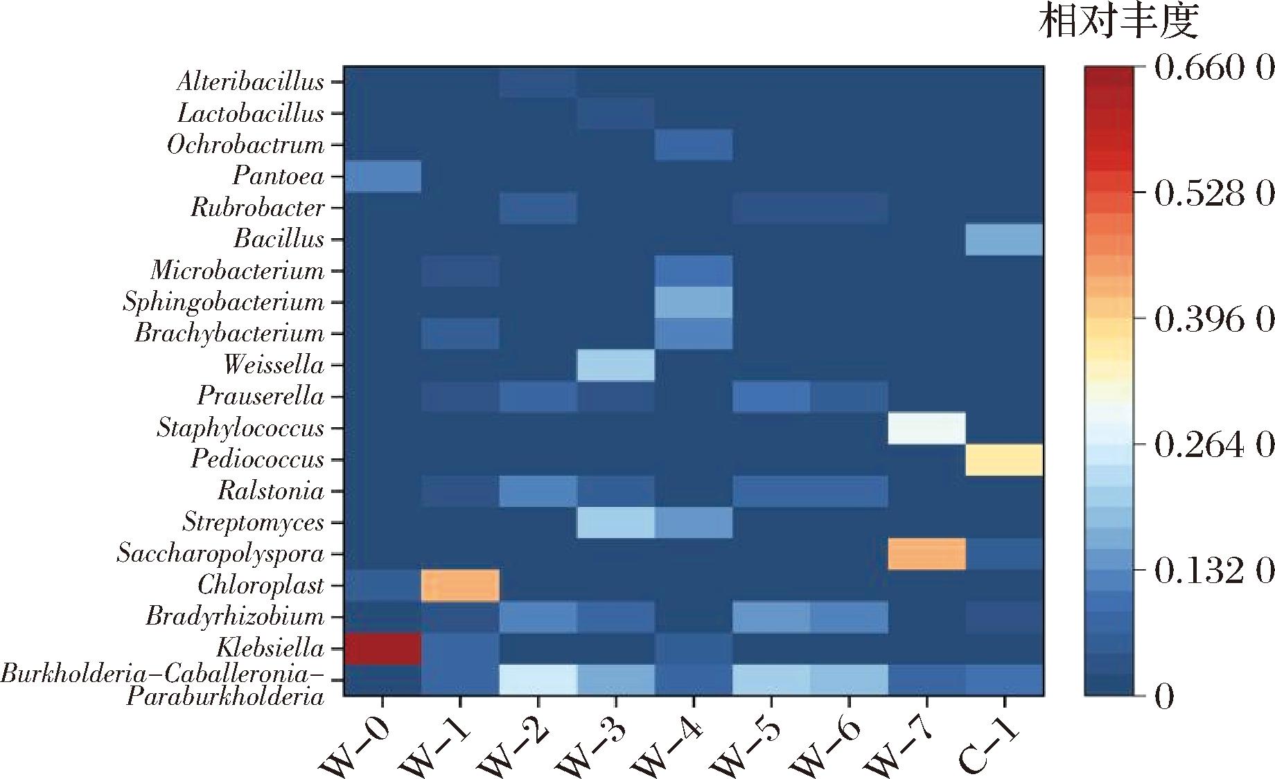 通过筛选相对丰度前20的菌属,构建热图来直观展示不同菌属的分布情况。从图6中可以明显观察到,W-5和W-6样本中的物种数量相对较少,而W-0样本则表现出最多的物种数量,其余由高到低分别是W-7、C-1、W-3、W-4、W-1、W-2。渥堆前期的优势属为克雷伯氏菌属(Klebsiella)、泛菌属(Pantoea),渥堆中后期的优势属为Chloroplast、Burkholderia-Caballeronia-Paraburkholderia、Streptomyces、Pediococcus、Staphylococcus、Saccharopolyspora、芽孢杆菌属(Bacillus)等,这与前人[21-22]的研究结果有一定相似性。