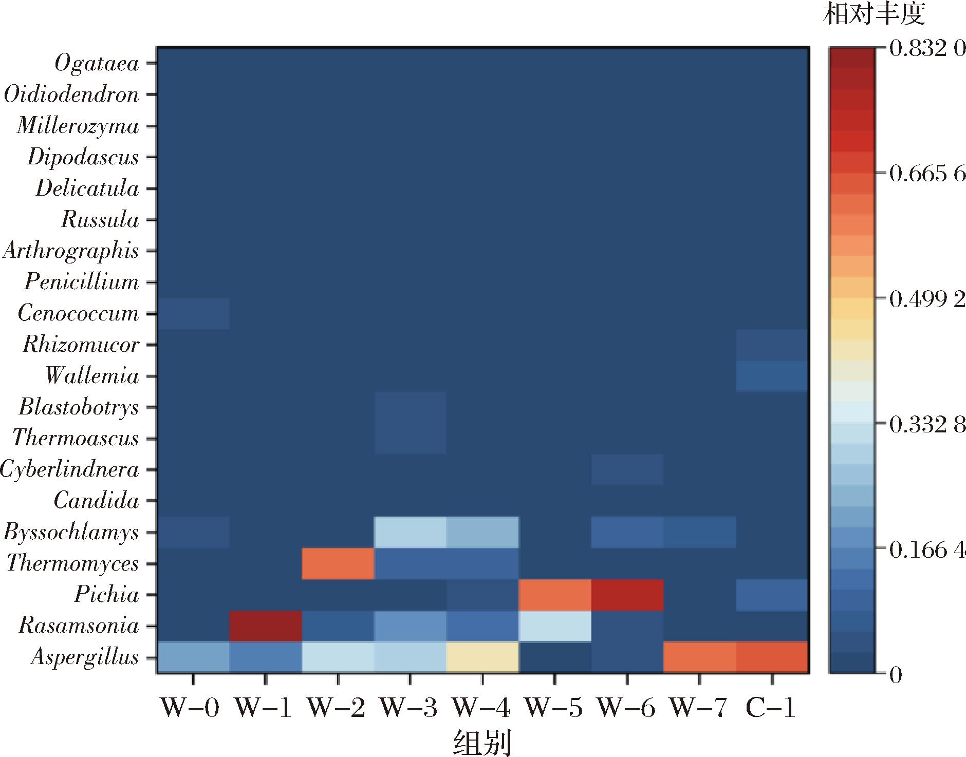 为了深入剖析渥堆过程中不同茶样间物种组成的差异,基于属水平前20位物种的平均丰度数据绘制了热图。如图4所示,茶样W-0显示出最低的物种数量,而茶样W-6则呈现出最多的物种数量,为其余的由高到低依次是W-5、W-3、W-4、W-2、W-1、C-1、W-7。由图4可知,Aspergillus为渥堆前期的优势菌属,Rasamsonia、Thermomyces、丝衣霉属(Byssochlamys)、Pichia等为渥堆中期的优势菌属,Aspergillus为渥堆后期的优势菌属,再次说明Aspergillus为黑茶渥堆过程中的绝对优势菌属,这与白亚妮等[19]对茯茶加工过程真菌群落结构分析相对一致。