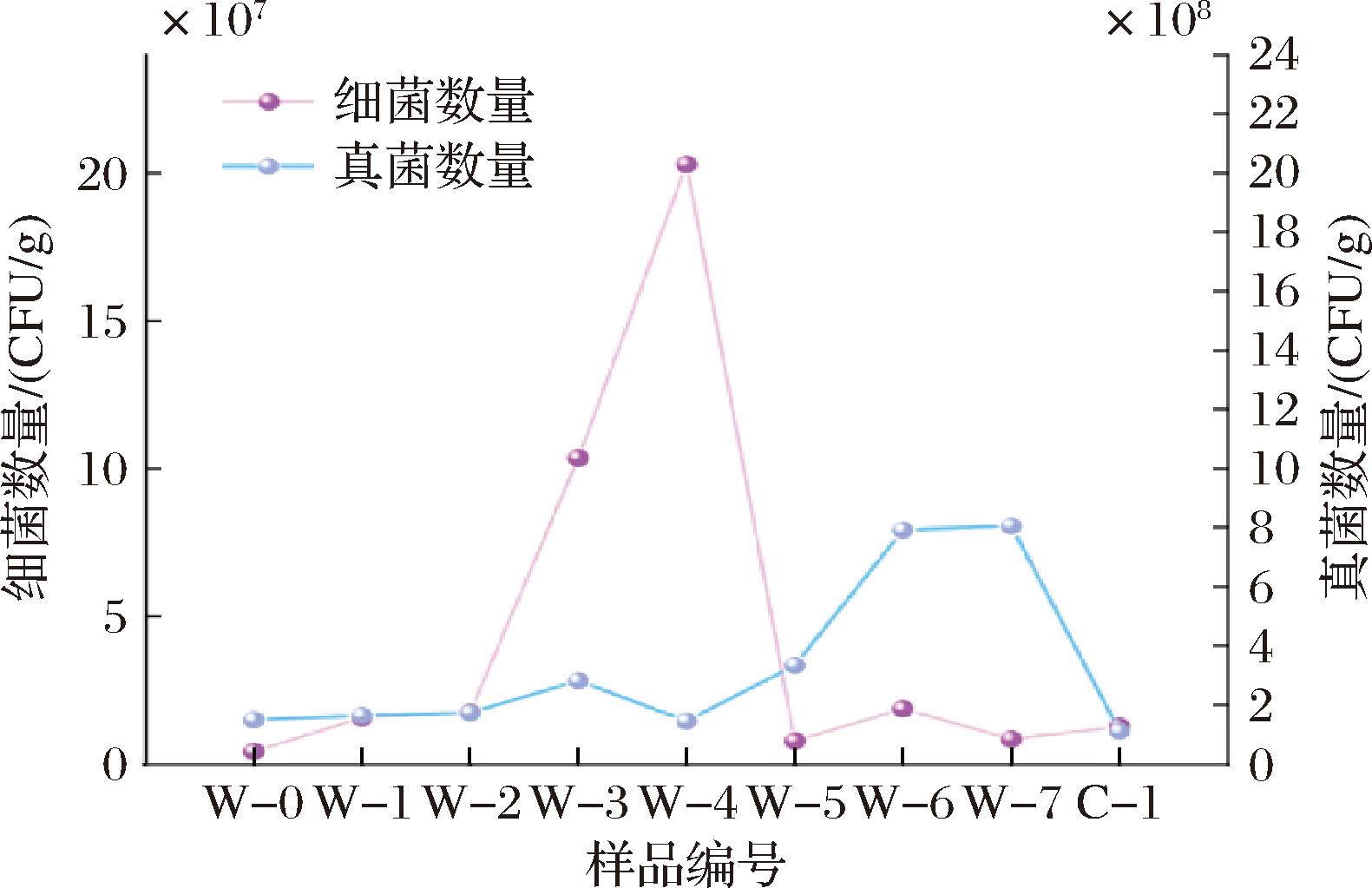 细菌数量(图1)在W-0~W-2,细菌数量增长迟缓。然而,当到达W-3时,细菌数量急剧上升。在W-4时,细菌数量达到峰值,即2.03×109 CFU/g。此后,在W-5时刻,细菌数量迅速减少。在随后的渥堆过程中,细菌数量持续下降。