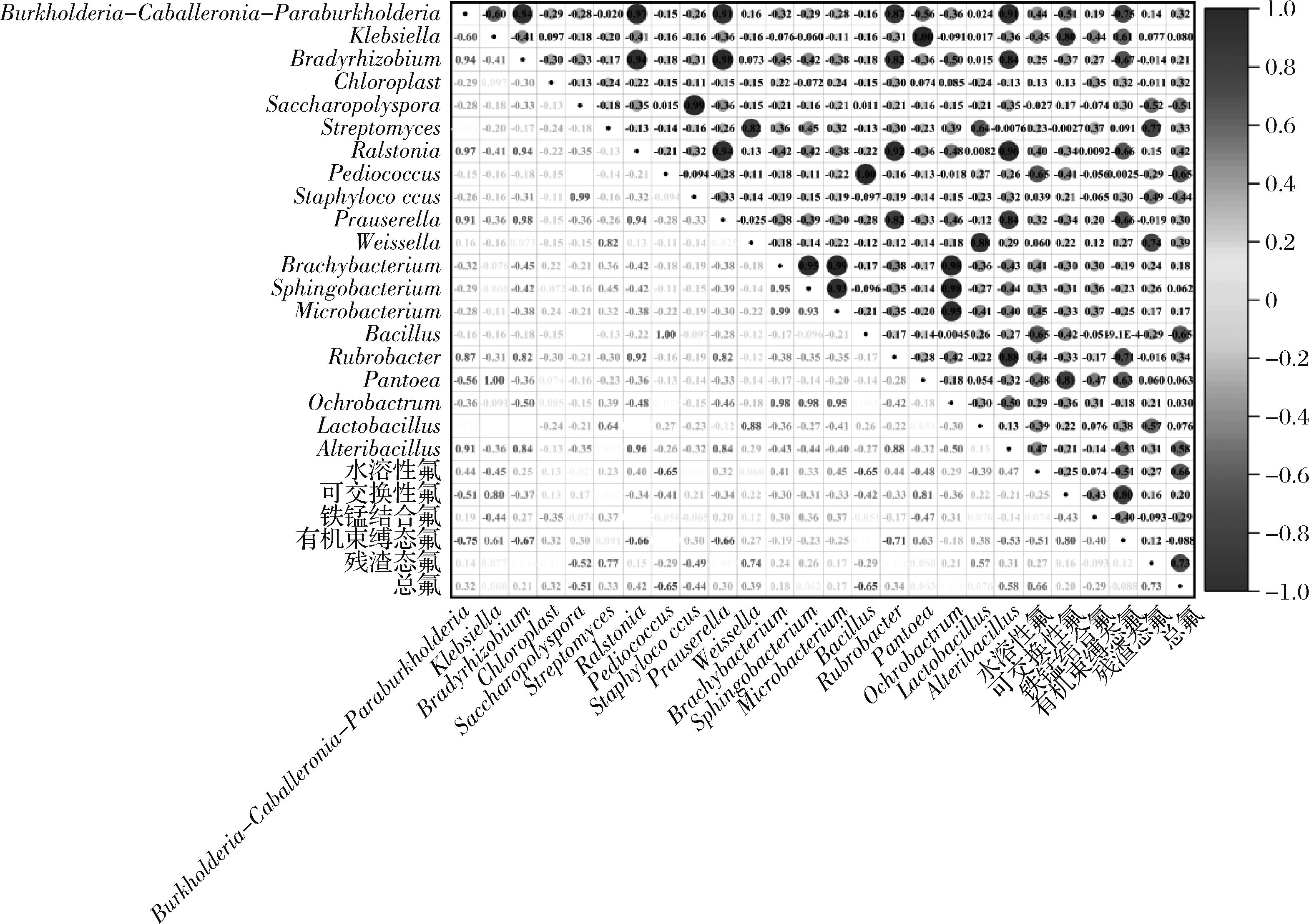 由图8可知,总氟与Alteribacillus有较强的正相关性,相关系数为0.58,与Bacillus、Pediococcus和Saccharopolyspora有较强的负相关性,相关系数为-0.65、-0.65、-0.51;残渣态氟与Streptomyces和Weissella呈强正相关性,相关系数为0.77、0.74,与Saccharopolyspora有较强负相关性,相关系数为-0.52;有机束缚态氟与Klebsiella和Pantoea存在较强正相关性,相关系数为0.61、0.63,与Burkholderia-Caballeronia-Paraburkholderia、Bradyrhizobium、罗尔斯顿菌属(Ralstonia)、Prauserella和红色杆菌属(Rubrobacter)呈强负相关,相关系数为-0.75、-0.67、-0.66、-0.66、-0.71;铁锰结合氟与Pantoea和Klebsiella存在一定的负相关性,相关系数为-0.47、-0.44;可交换性氟含量与Pantoea和Klebsiella呈强正相关性,相关系数为0.81、0.80,与Burkholderia-Caballeronia-Paraburkholderia存在一定负相关性,相关系数为-0.51;水溶性氟与Bacillus和Pediococcus存在较强的负相关性,相关系数均为-0.65,与Pantoea存在一定负相关性,相关系数为-0.48。
