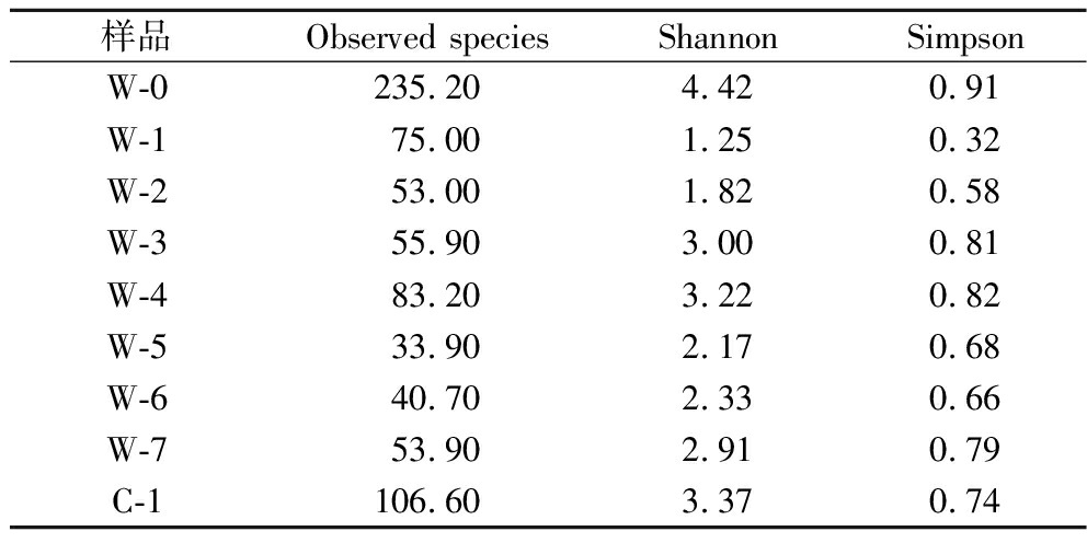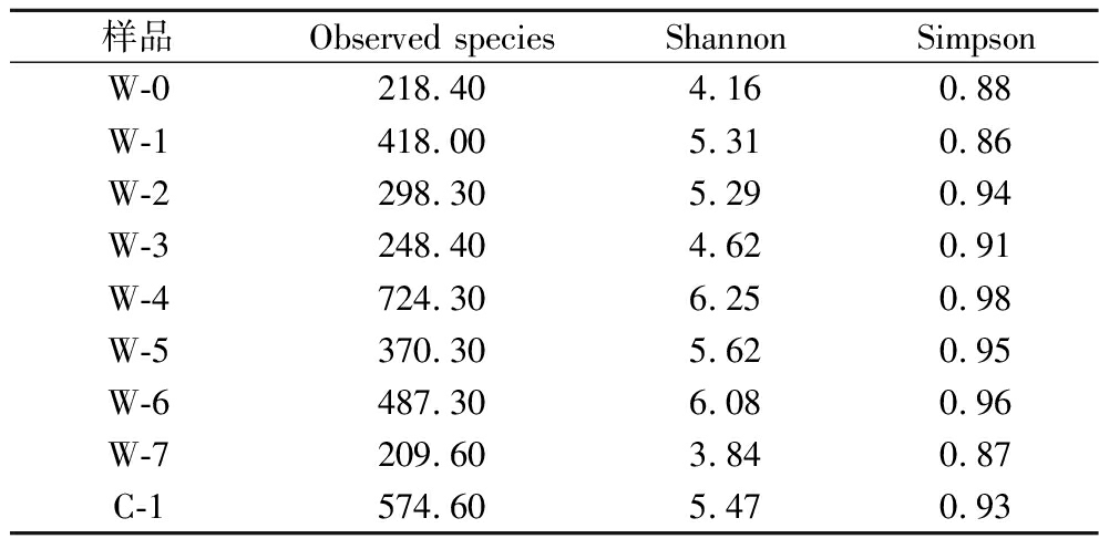 样品Observed speciesShannonSimpsonW-0218.40 4.16 0.88 W-1418.00 5.31 0.86 W-2298.30 5.29 0.94 W-3248.40 4.62 0.91 W-4724.30 6.25 0.98 W-5370.30 5.62 0.95 W-6487.30 6.08 0.96 W-7209.60 3.84 0.87 C-1574.60 5.47 0.93