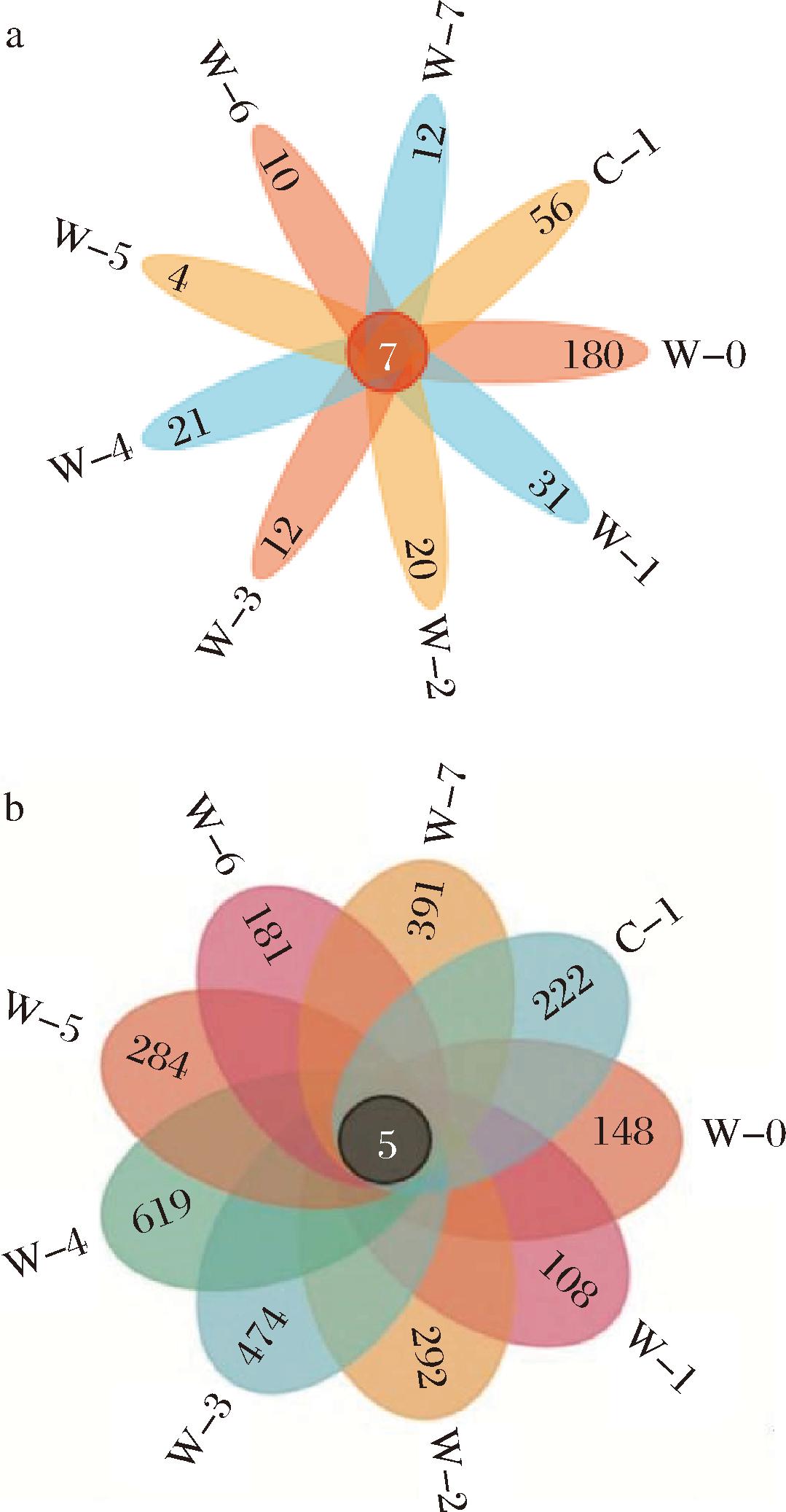 按照97%相似性非重复序列进行操作分类单元(operational taxonomic unit,OTU)聚类,绘制Venn图。Venn图能够有效地揭示多组或多个样本之间OTU的共有和独特分布情况,为统计分析提供直观依据。如图2所示,不同渥堆阶段茶样中的真菌群落OTU数目分别是180、31、20、12、21、4、10、12、56,共有OTU为7个,表明真菌群落的OTU数目在渥堆起点达到最大值之后,在W-1迅速降低,随后一直处于降低的范围中,在C-1时又略微升高,但没有W-0时高,说明茶叶渥堆过程中真菌种类在渥堆起点多样性高。