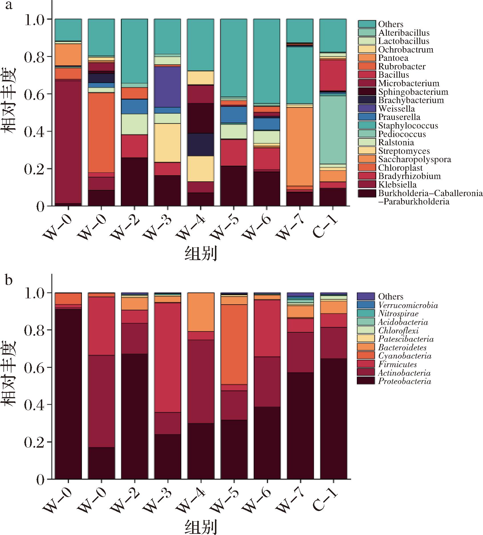 除未分类的细菌外,如图5-a所示,黑茶渥堆过程中的茶样共检测出10个细菌门。绝对优势门为变形菌门(Proteobacteria),相对丰度为16.87%~90.99%。厚壁菌门(Firmicutes)、放线菌门(Actinobacteria)在茶叶渥堆过程的占比也比较大,分别为1.68%~58.69%、1.04%~49.54,这与周金萍[20]在布朗酸茶发酵过程中细菌群落结构一致。在W-2阶段,蓝细菌门(Cyanobacteria)的相对丰度为42.86%,而在其他阶段的相对丰度几乎为0,与之相似的还有拟杆菌门(Bacteroidetes),在W-4阶段的相对丰度为20.69%,在其他阶段的相对丰度也几乎为0,说明这2种菌门在渥堆中期占主导作用。