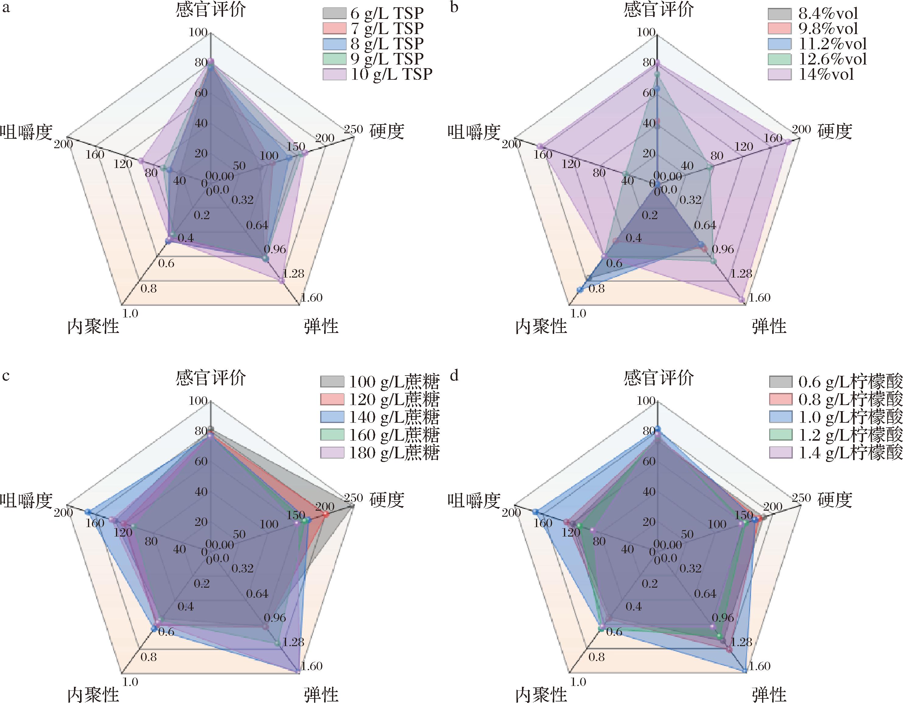 硬度可以体现酒冻的强度,弹性是评价果冻与酒冻产品性能的主要指标,内聚性和咀嚼度可以部分体现酒冻内部结构凝聚状态与感官评价水平[22],将这4项质构指标与感官评价结果共同组成的雷达图。如图4所示,参与测试的志愿者普遍认为TSP与酒冻酒精度增大会优化酒冻的外观与口感,最佳的TSP添加量为10 g/L,此时无论是弹性还是咀嚼度的表现维持在最高水平。而酒冻的酒精度在11.2%vol时评分最高,过低的酒精浓度不仅会降低各项质构特性评分,而且会影响吞咽障碍人群的食用安全。而蔗糖会对硬度、弹性和咀嚼度产生明显的影响,随着蔗糖浓度的提高,酒冻的硬度下降,相应的弹性会随之提高。而柠檬酸会影响酒冻的感官评分,1.0 g/L的柠檬酸含量在咀嚼度和弹性水平的表现优秀。蔗糖和柠檬酸2种调味配料的添加需要维持在适量的水平,以确保酒冻在感官评价良好的前提下质构特性表现更加均衡。质构特性也可以量化吞咽障碍人群对食品的特殊需求。TSP黄酒酒冻的内聚性>0.2,并且咀嚼度、硬度维持在适中水平,同时具有足够的弹性,表明其易于吞咽障碍人群食用的特点[31]。