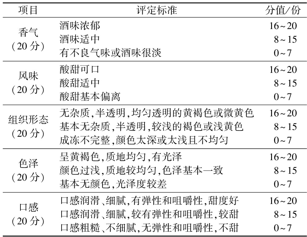 项目评定标准分值/份香气(20分)酒味浓郁酒味适中有不良气味或酒味很淡16^208^150^7风味(20分)酸甜可口酸甜适中酸甜基本偏离16^208^150^7组织形态(20分)无杂质,半透明,均匀透明的黄褐色或微黄色基本无杂质,半透明,较浅的褐色或浅黄色成冻不完整,颜色太深或太浅且不均匀16^208^150^7色泽(20分)呈黄褐色,质地均匀,有光泽颜色过浅,质地较均匀,色泽基本一致基本无颜色,光泽度较差16^208^150^7口感(20分)口感润滑、细腻,有弹性和咀嚼性,甜度好口感润滑、细腻,较有弹性和咀嚼性,较甜口感粗糙、不细腻,无弹性和咀嚼性,不甜16^208^150^7
