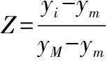 式中:yM,该指标的最大值;ym,最小值;yi,平均值。脱液收缩率的计算中,使用果冻常见的脱液收缩率(3%)-黄酒酒冻脱液收缩率,再代入上式进行计算可得Z脱液。