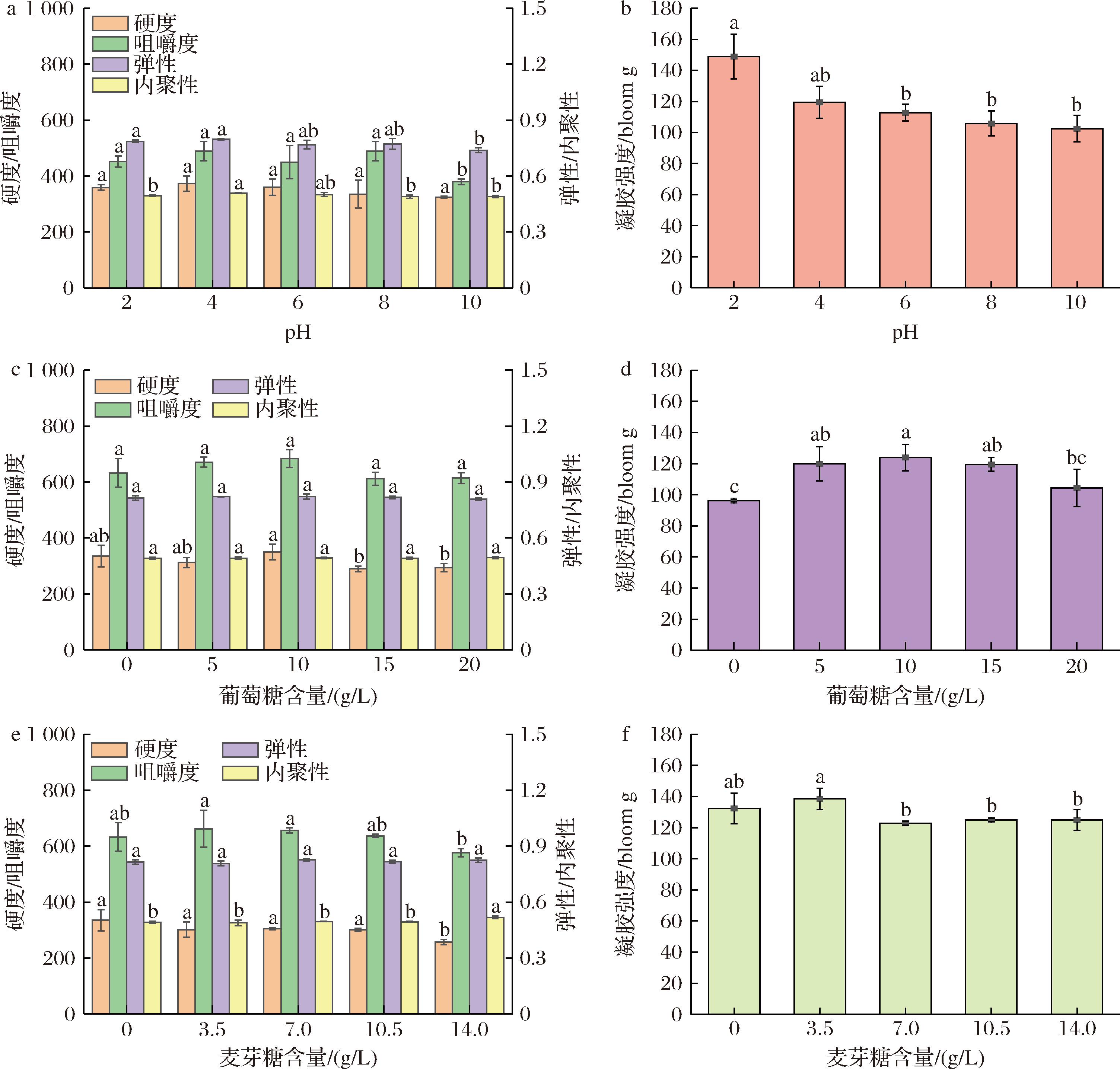 a-质构特性随pH的变化;b-凝胶强度随pH的变化;c-质构特性随葡萄糖含量的变化;d-凝胶强度随葡萄糖含量的变化;e-质构特性随麦芽糖含量的变化;f-凝胶强度随麦芽糖含量的变化