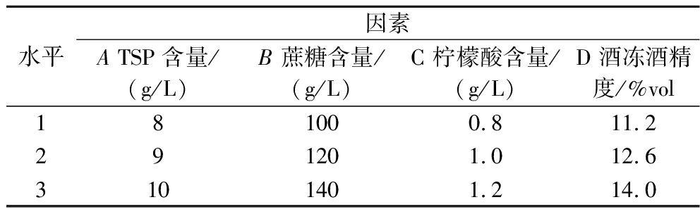 水平因素A TSP含量/(g/L)B 蔗糖含量/(g/L)C 柠檬酸含量/(g/L)D 酒冻酒精度/%vol181000.811.2291201.012.63101401.214.0