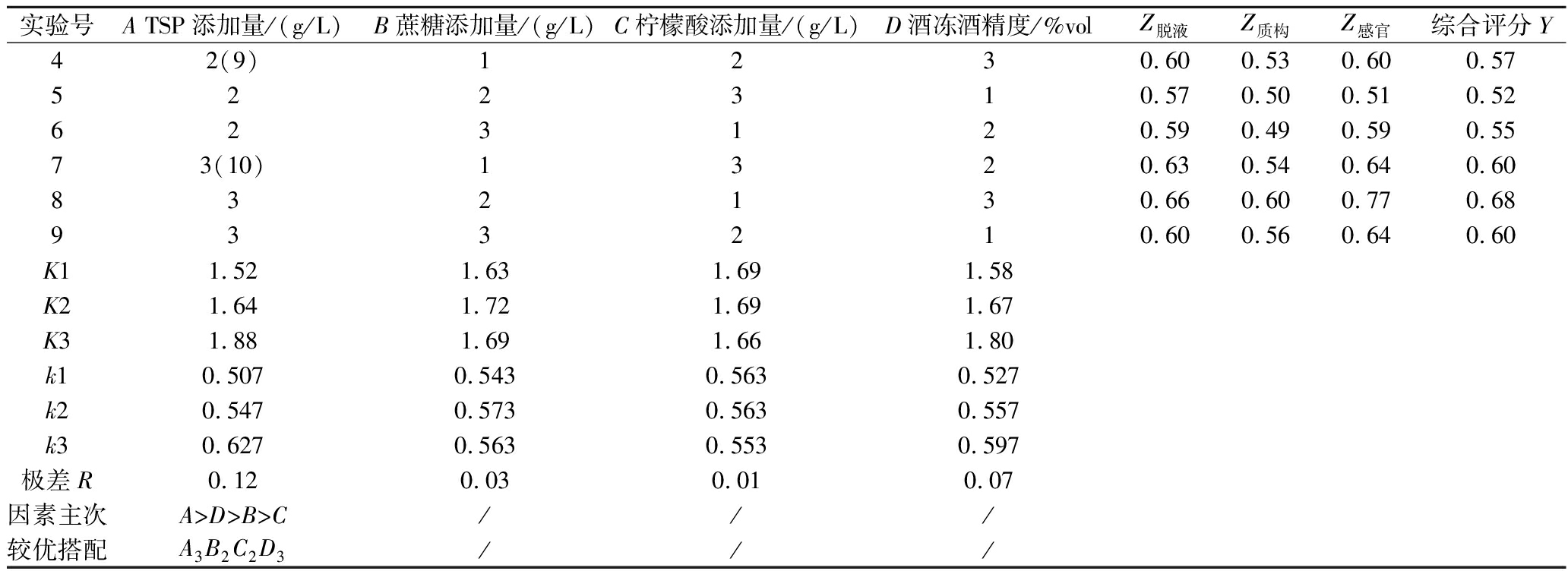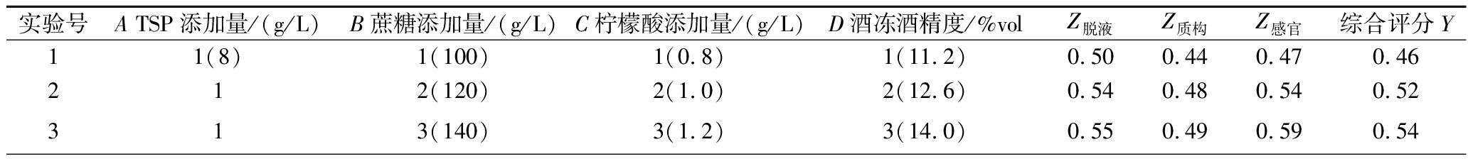 由单因素的结果,得到各因素较佳的范围,以TSP含量(A)、蔗糖含量(B)、柠檬酸含量(C)和酒冻酒精度(D)进行4因素3水平的正交试验,并进行综合评分,对黄酒酒冻制备工艺进行优化,正交试验设计如表1所示。