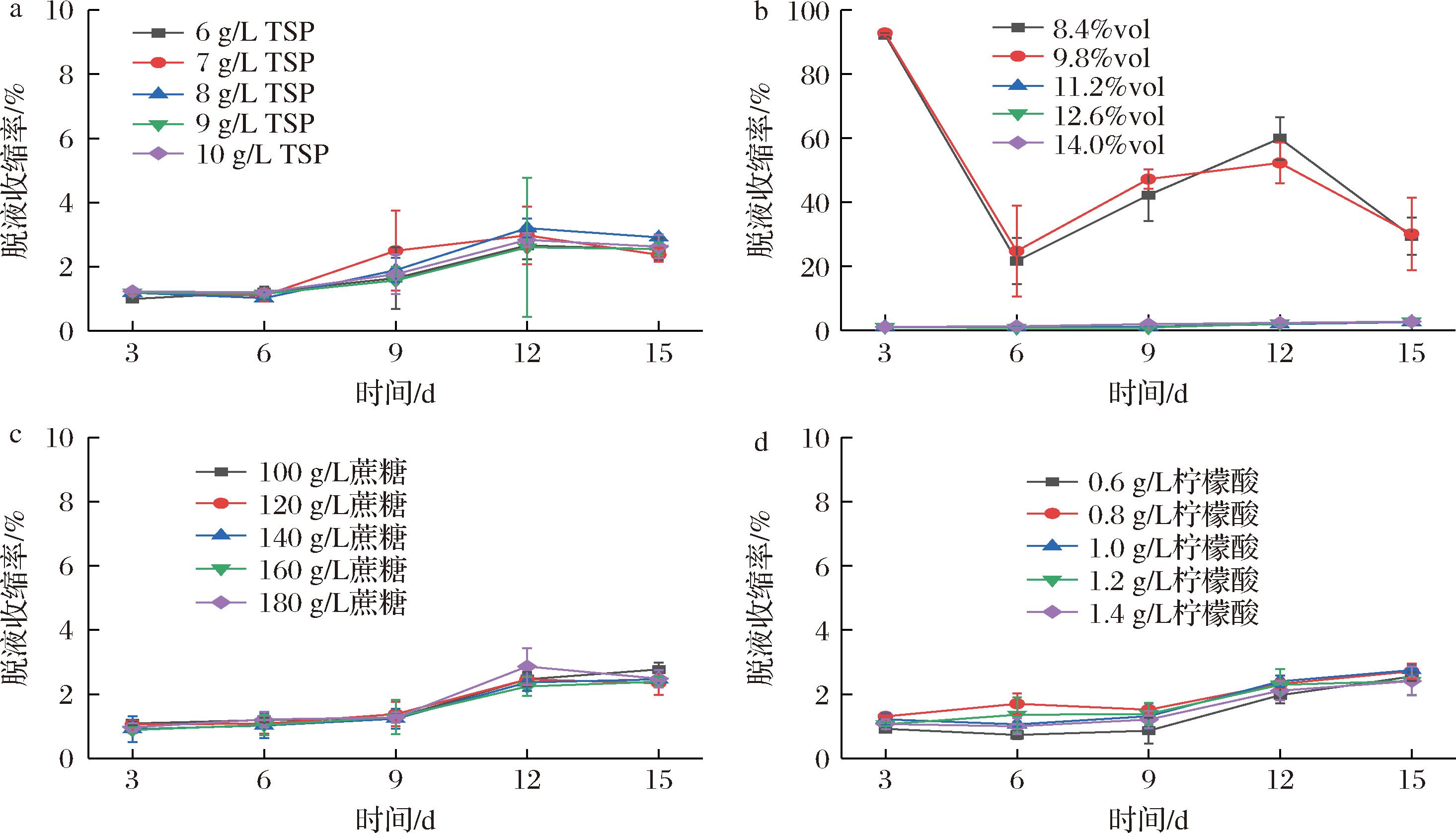 酒冻产品在形成凝胶时会出现脱液收缩现象,也称析水现象。这种现象的发生是由于醇凝胶中的凝胶结构在冷却过程中,水分逐渐从凝胶网状结构中逸出,形成液体分层[30]。脱液收缩不仅会影响酒冻的外观,还可能对产品的感官质量和稳定性产生负面影响,对于吞咽障碍人群而言,更低的脱液收缩率也降低了食用过程中液体进入肺部甚至窒息的风险。如图3所示,除了一些酒冻酒精度较低的样品外,其他大部分酒冻样品在15 d储存过程中,脱液收缩率均保持在较低的水平(<3.0%)。这表明,在酒冻的制备过程中,TSP与低浓度乙醇形成的醇凝胶能够有效延缓脱液现象的发生,并且保持酒冻的结构稳定性。同时,TSP的添加还能够有效保持酒冻中的酒液成分,满足吞咽障碍人群对享受黄酒风味的需要。