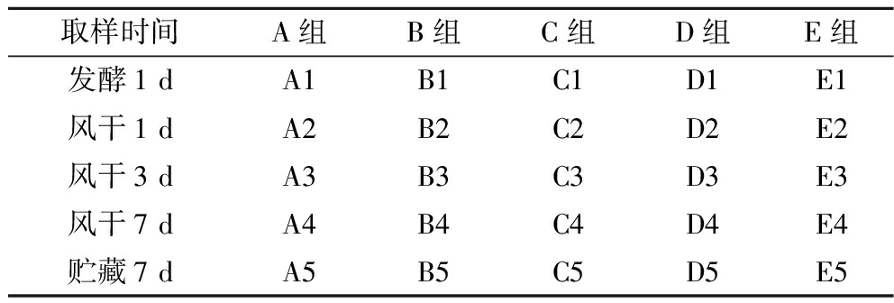取样时间A组B组C组D组E组发酵1 dA1B1C1D1E1风干1 dA2B2C2D2E2风干3 dA3B3C3D3E3风干7 dA4B4C4D4E4贮藏7 dA5B5C5D5E5