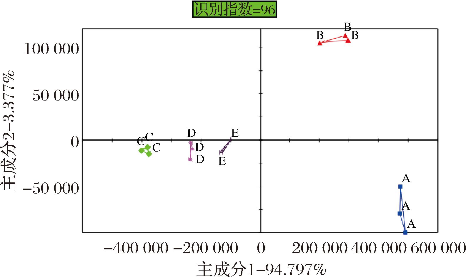 图3为经电子鼻检测后5组风干牛肉贮藏7 d样品中挥发性物质的主成分分析图。第一主成分PC1贡献率为94.797%,第二主成分PC2的贡献率为3.377%,这表明主成分分析能有效反映样品中挥发性风味物质的实际情况。主成分分析图的识别指数为96,表明可以在气味上能有效区分5个风干牛肉样品。由图3可知A、B组与C、D、E组相距较远,说明A、B 2组与其余3组气味相差较大。D组与对照组E组相距较近,表明D组与E组风干牛肉气味相差较小。