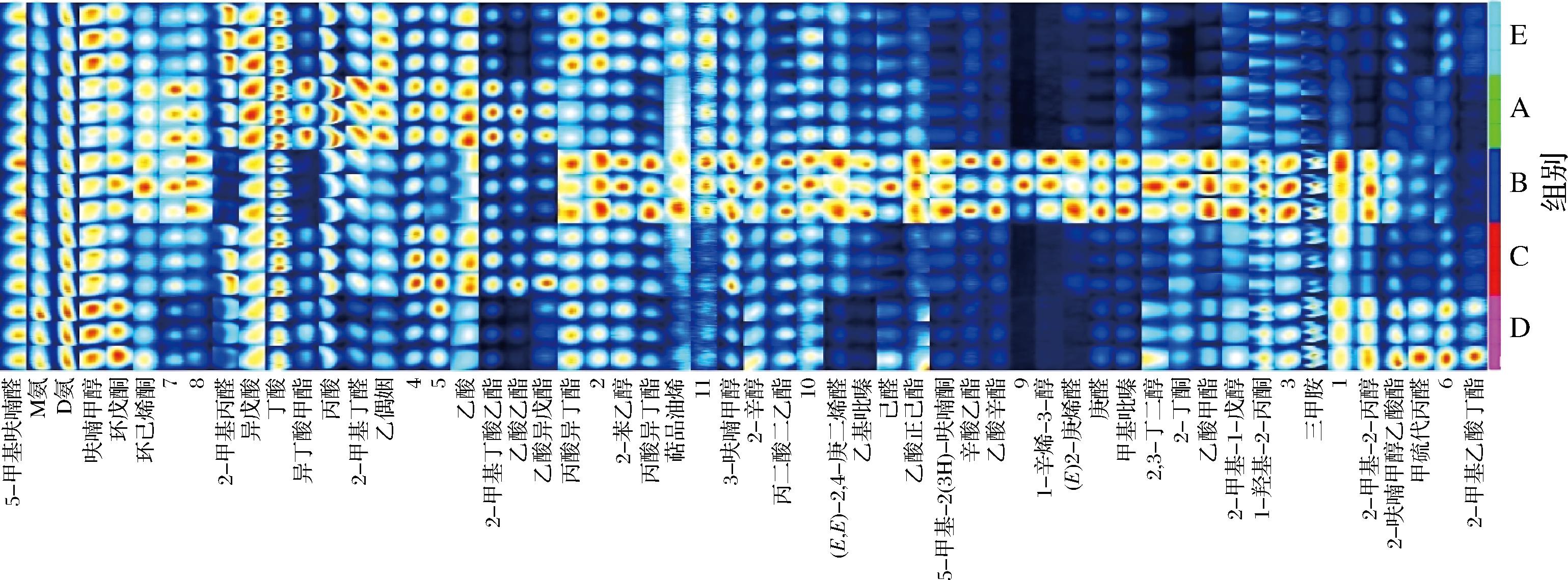为了更清晰地比较不同处理组样品中挥发性物质的异同,将样品中所有化合物信号峰构建风干牛肉挥发性物质指纹图谱,其中每一行代表一种样品,每组样品重复3次(右侧相同色块标注)。每一列则表示同一种化合物在不同样品中的信号峰,颜色越红,代表该物质在样品中的含量越高。风干牛肉指纹图谱结果表明,5组样品的特征图谱存在一定差异,且B组样品的挥发性风味物质的种类最多且含量也最高。图6中红色方框中的丁酸丙酯、丙二酸二乙酯、辛酸乙酯、丙酸异丁酯、乙酸甲酯、己酸正异戊酯、乙酸辛酯、2-辛醇、1-辛烯-3-醇、2,3-丁二醇、2-甲基-1-戊醇、2-甲基-2-丙醇、2-苯乙醇、3-呋喃甲醇、萜品油烯等物质在B组中含量很高,其中2,3-丁二醇、1-辛烯-3-醇、(E)2-庚烯醛、乙酸辛酯、辛酸乙酯仅存在于B组中;丁酸丙酯、丙酸异丁酯、2-苯乙醇、萜品油烯等物质在对照E组样品中含量仅次于B组,而乙酸甲酯、1-羟基-2-丙酮、2-甲基-1-戊醇、2-甲基-2-丙醇、三甲胺等物质在D组样品中含量也仅次于B组。黄框中的甲硫代丙醛和2-甲基乙酸丁酯等物质在D组样品中含量较高,其中2-甲基丁基乙酸酯仅存在于该样品中,这有可能是由D组中接种的3种乳酸菌共同作用的结果。绿框中的乙酸乙酯、2-甲基丁酸乙酯、乙酸异戊酯、乙酸在A组和B组样品中含量高于其他组。紫色框中的异戊酸、丁酸在对照E组中含量较高,在A组样品中含量也比较高,在其他处理组的牛肉样品中含量略低。丙酸、2-甲基丙酸甲酯、2-甲基丁醛在A组样品里含量高于其他样品。从以上结果可以看出,B组样品中醇和酯类的含量相比于其他组更高,说明格氏乳球菌TC-6和乳酸乳球菌TC-2按照1∶1复配作为发酵剂生产风干牛肉,可以增加风干牛肉中醇类和酯类风味物质的产生,从而赋予风干牛肉一定水果香气[29]。D组样品中挥发性风味物质指纹图谱与B组较为接近,可能是因为D组添加的发酵剂是3种乳酸菌的混合物,其中包括了格氏乳球菌TC-6和乳酸乳球菌TC-2,而戊糖片球菌TMR-WJG所产的蛋白酶活力稍弱,在本组试验中对蛋白质的降解不起主导作用,因此B组和D组风干牛肉样品的风味特征较为相似。A组和C组风干牛肉的挥发性风味物质种类和含量均与B组差异较大,这有可能是因为这2组样品中均添加的戊糖片球菌TMR-WJG影响了风干牛肉挥发性风味物质的产生,这可能跟戊糖片球菌TMR-WJG产生的蛋白酶活力不高有关[28]。