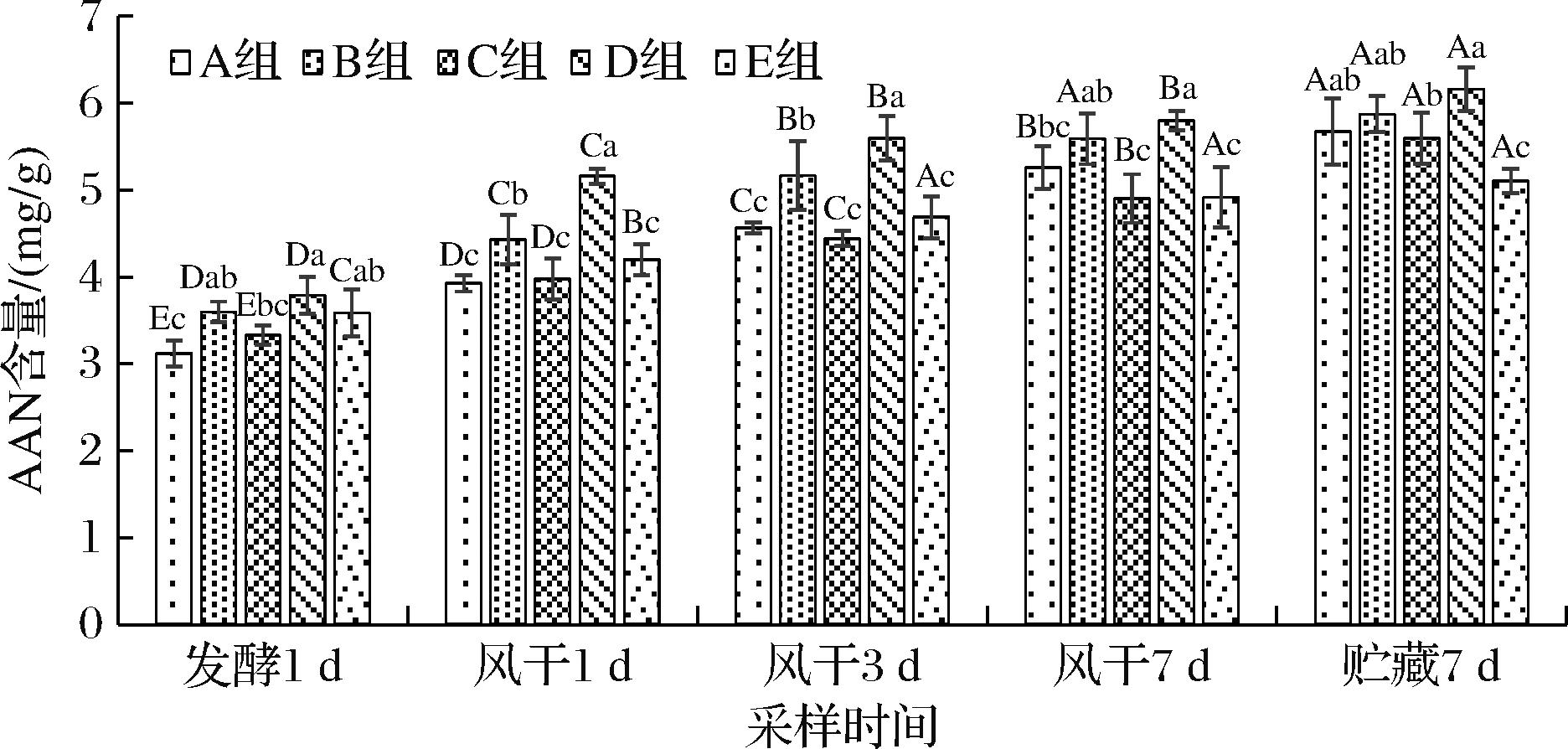 AAN是以氨基酸形式存在的氮元素,包括水溶性蛋白、多肽和氨基酸等物质,在一定程度上可以反映发酵产品的发酵程度,对产品特征风味的形成具有一定的作用。如图2所示,所有样品中AAN含量均随加工时间延长而不断增加(P<0.05),其中B组和D组中AAN含量从风干期开始增加值始终高于对照E组(P<0.05)。贮藏7 d时B组和D组AAN含量达到最高,分别为5.87、6.16 mg/g,而E组AAN含量仅为5.11 mg/g。A组和C组从发酵期到风干3 d,AAN含量始终低于对照E组,而风干7 d和贮藏7 d样品中AAN含量超过对照E组,这可能是因为A组和C组中添加的戊糖片球菌TMR-WJG所产生的蛋白酶活力不够[13],从而限制了肌原纤维蛋白的降解,导致在风干前期AAN含量增速过慢;但随着加工时间的延长,A组和C组中乳酸菌不断繁殖,产生的蛋白酶量不断累积,使得AAN含量不断增加。E组中由于缺少外源添加的发酵剂,因此AAN含量增速较慢。范露等[20]在研究宣威火腿发酵过程中AAN变化规律时也发现,在发酵中前期AAN快速升高,末期AAN增速减缓,这与该研究结果基本一致。蛋白质的降解贯穿于风干牛肉加工的整个过程,尤其是在风干前期,这种水解程度更为明显,为风干牛肉特有风味的形成发挥重要作用。因此,B组和D组的AAN含量最高,对产品特征风味的形成具有一定的作用。