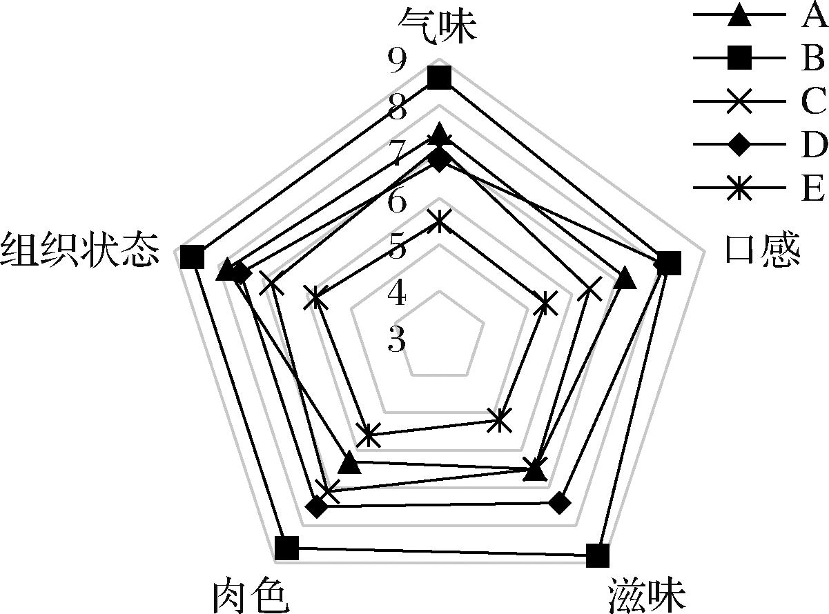 如图7所示,对接种不同发酵剂的风干牛肉肉色、滋味、口感、气味、组织形态5个方面进行感官评定。结果显示,接种发酵组评分均大于E组,发酵组和E组在气味、肉色方面的差别明显,E组略有霉味,发酵组具有特殊果香味。感官评分中B组明显高于其他组,这与风干牛肉的风味指标一致。说明添加格氏乳球菌TC-6和乳酸乳球菌TC-2在一定程度上可以提高风干牛肉的整体风味品质。